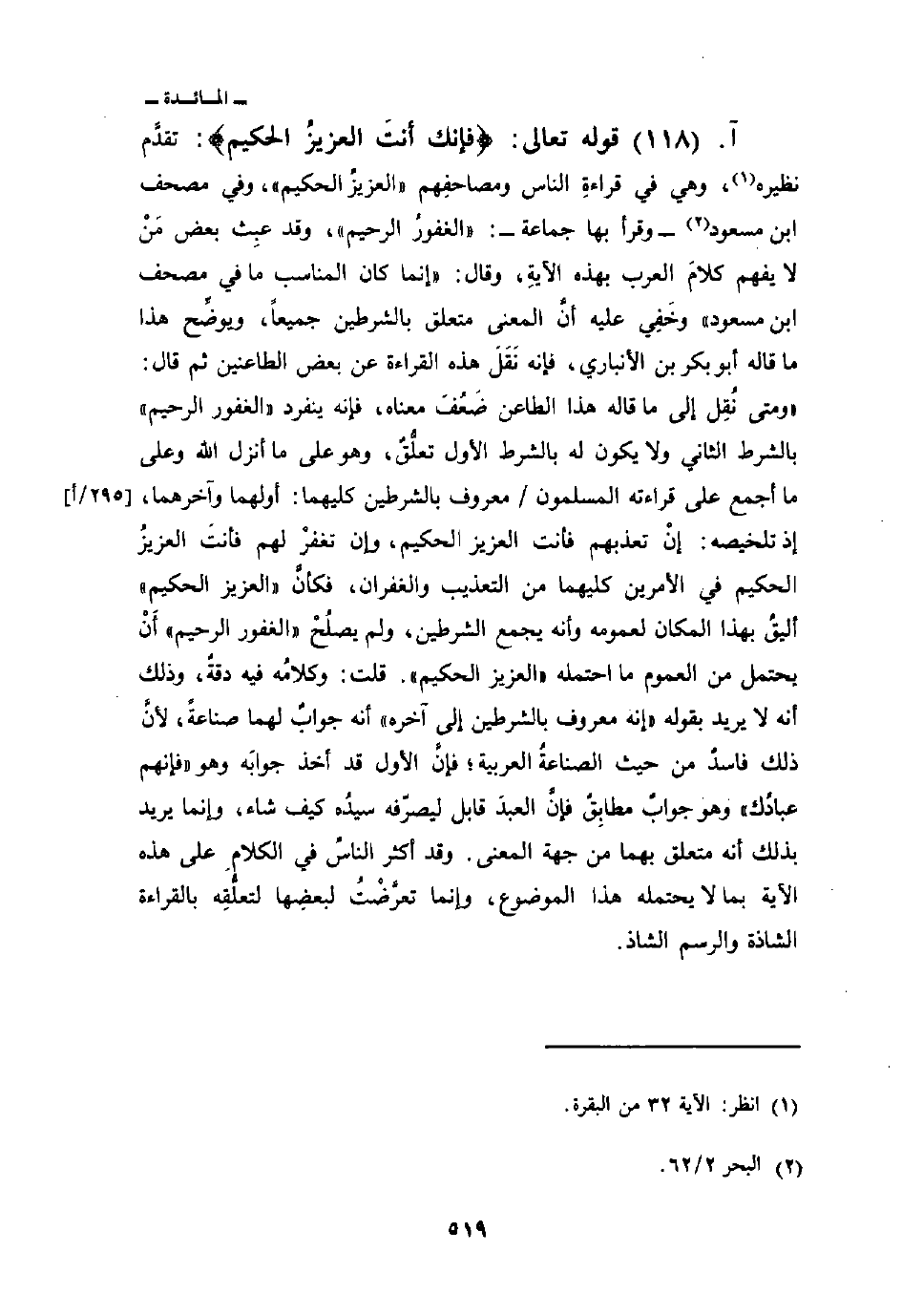 قوله تعالى: {فَإِنَّكَ أَنتَ العزيز الحكيم} : تقدَّم نظيره، وهي في قراءةِ الناس ومصاحفِهم «العزيزُ الحكيم» وفي مصحف ابن مسعود - وقرأ بها جماعة -: «الغفورُ الرحيم» ، وقد عبِث بعض مَنْ لا يفهم كلامَ العرب بهذه الآيةِ، وقال: «إنما كان المناسب ما في مصحف ابن مسعود» وخَفِي عليه أنَّ المعنى متعلق بالشرطين جميعاً، ويوضِّح هذا ما قاله أبو بكر بن الأنباري، فإن نَقَل هذه القراءة عن بعض الطاعنين ثم قال: «ومتى نُقِل ما قاله هذا الطاعن ضَعُفَ معناه، فإنه ينفرد» الغفور الرحيم «بالشرط الثاني ولا يكون له بالشرط الأول تعلُّقٌ، وهو على ما أنزل الله وعلى ما أجمع على قراءته المسلمون معروف بالشرطين كليهما: أولهما وآخرهما، إذ تلخيصه: إنْ تعذبهم فأنت العزيز الحكيم، وإن تغفرْ لهم فأنتَ العزيزُ الحكيم في الأمرين كليهما من التعذيب والغفران، فكأنَّ» العزيز الحكيم «أليقُ بهذا المكان لعمومه وأنه يجمع الشرطين، ولم يصلُحْ» الغفور الرحيم «أَنْ يحتمل من العموم ما احتمله» العزيز الحكيم «قلت:» وكلامُه فيه دقةٌ، وذلك أنه لا يريد بقوله «إنه معروف بالشرطين إلى آخره» أنه جوابٌ لهما صناعةً، لأنَّ ذلك فاسدٌ من حيث الصناعةُ العربية؛ فإنَّ الأول قد أخذ جوابَه وهو «فإنهم عبادُك» وهو جوابٌ مطابِقٌ فإنَّ العبدَ قابل ليصرّفه سيدُه كيف شاء، وإنما يريد بذلك أنه متعلق بهما من جهة المعنى. وقد أكثر الناسُ في الكلامِ على هذه الآية بما لا يحتمله هذا الموضوع، وإنما تعرَّضْتُ لبعضِها لتعلُّقِه بالقراءة الشاذة والرسم الشاذ.