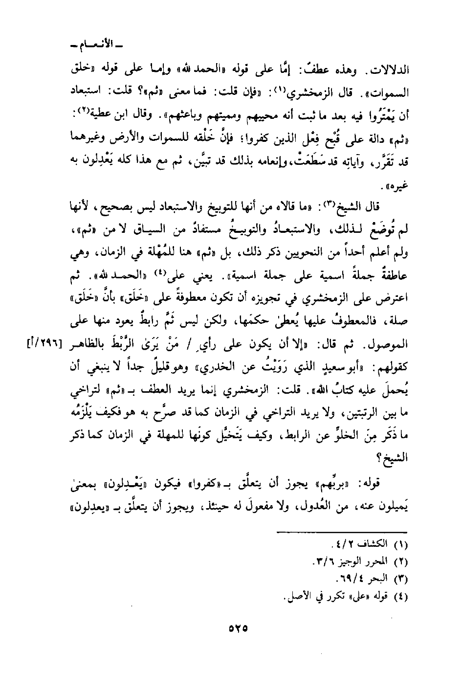 قال الشيخ: «ما قالاه من انها للتوبيخ والاستبعاد ليس بصحيح، لأنها لم تُوضَعْ لذلك، والاستبعادُ والتوبيخُ مستفادٌ من السياق لا من» ثم «، ولم أعلم أحداً من النحويين ذكر ذلك، بل» ثم «هنا للمُهْلة في الزمان، وهي عاطفةٌ جملةً اسمية على جملة اسمية» . يعني على «الحمد لله» . ثم اعترض على الزمخشري في تجويزه أن تكون معطوفةً على «خَلَق» بأنَّ «خَلَق» صلة، فالمعطوفُ عليها يُعطى حكمَها، ولكن ليس ثَمَّ رابطٌ يعود منها على الموصول. ثم قال: «إلا أن يكون على رأيِ مَنْ يَرى الرَّبْطَ بالظاهر كقولهم: أبو سعيدٍ الذي رَوَيْتُ عن الخدري» وهو قليلٌ جداً لا ينبغي أن يُحملَ عليه كتابُ الله «. قلت: الزمخشري إنما يريد العطف ب» ثم «لتراخي ما بين الرتبتين، ولا يريد التراخي في الزمان كما قد صرَّح به هو فيكف يَلْزمُه ما ذَكَرَ مِنَ الخلوِّ عن الرابط، وكيف يَتَخيَّل كونَها للمهلة في الزمان كما ذكر الشيخ؟