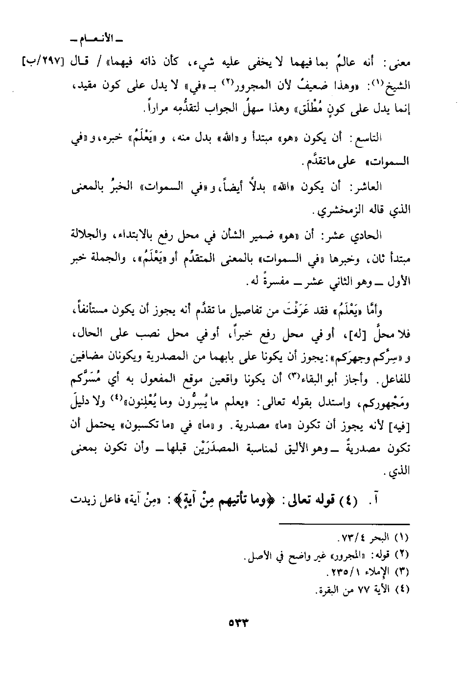 الحادي عشر: أن «هو» ضمير الشأن في محل رفع بالابتداء، والجلالة مبتدأ ثان، وخبرها «في السماوات» بالمعنى المتقدَّم أو «يَعْلَمُ» والجملة خبر الأول - وهو الثاني عشر - مفسرةً له.