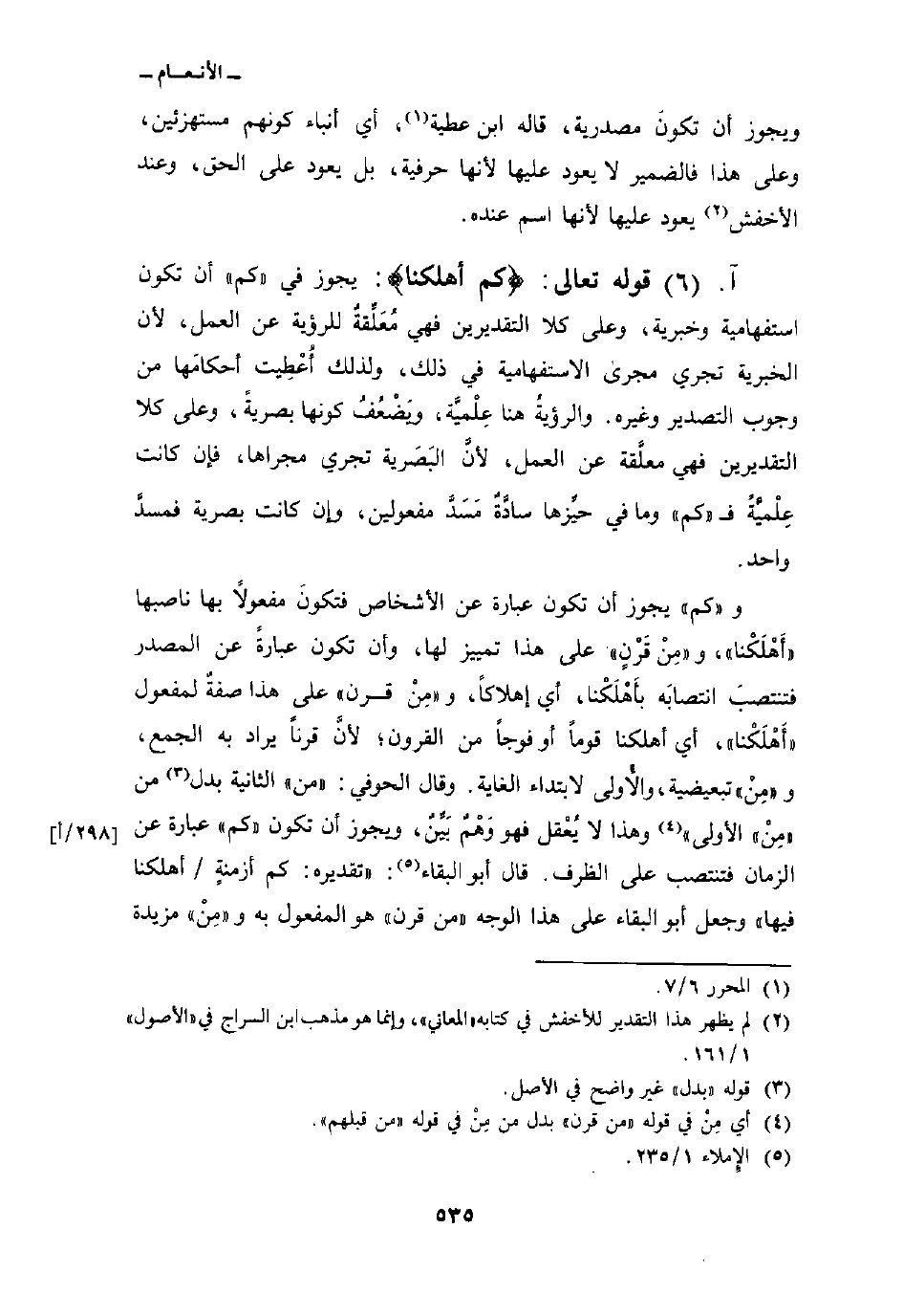 و «كم» يجوز أن تكون عبارة عن الأشخاص فتكونَ معفولاً بها ناصبها «أَهْلَكْنا» و «مِنْ قَرْنٍ» على هذا تمييز لها، وأن تكون عبارةً عن المصدر فتنتصبَ انتصابَه بأهْلَكْنا، أي إهلاكاً، و «مِنْ قرن» على هذا صفةٌ لمفعول «أَهْلَكْنا» أي أهلكنا قوماً أو فوجاً من القرون؛ لأنَّ قرناً يراد به الجمع، و «مِنْ» تبعيضية، والأُولى لابتداء الغاية. وقال الحوفي: «من» الثانية بدل من «مِنْ» الأولى وهذا لا يُعْقل فهو وَهْمٌ بَيِّنٌ، ويجوز أن تكون «كم» عبارة عن الزمان فتنتصب على الظرف. قال أبو البقاء: «تقديره: كم أزمنةٍ أهلكنا فيها» وجعل أبو البقاء على هذا الوجه «من قرن» هو المفعول به و «مِنْ» مزيدة