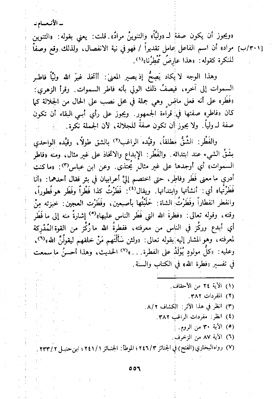 والفَطْر: الشَّقُّ مطلقاً، وقيَّده الراغب بالشق وقيَّده الواحدي بشَقِّ الشي عند ابتدائه. والفَطْر: الإِبداع والاتخاذ على غير مثال، ومنه» فاطر السماوات «أي أوجدها على غير مثالٍ يُحتذى. وعن ابن عباس:» ما كنت أدري ما معنى فَطَر وفاطِر، حتى اختصم إليَّ أعرابيان في بئر فقال أحدهما: «أنا فَطَرْتُها» أي: أنشأتها وابتدأتها. ويقال: فَطَرْتُ كذا فَطْر هو فُطوراً، وانفطر انفطاراً وفَطَرْتُ الشاة: حَلَبْتُها بأصبعين، وفَطَرْت العجين: خبزته مِنْ وقته، وقوله تعالى: {فِطْرَتَ الله التي فَطَرَ الناس عَلَيْهَا} [الروم: 30] إشارةً منه إلى ما فَطَر أي أبدع وركَّز في الناس من معرفته، ففطرةُ الله ما رُكِّز من القوة المُدْرِكة لمعرفته، وهو المشار إليه بقوله تعالى: {وَلَئِن سَأَلْتَهُم مَّنْ خَلَقَهُمْ لَيَقُولُنَّ الله} [الزخرف: 87] ، وعليه: «كلُّ مولودٍ يَوْلَدُ على الفطرة. . .» الحديث، وهذا أحسنُ ما سمعت في تفسير «فطرة الله» في الكتاب والسنة.