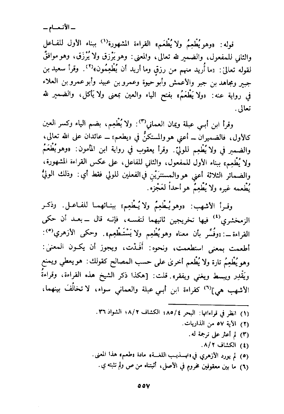 وقرأ الأشهب: {وهو يُطْعِمُ ولا يُطْعِم} ببنائهما للفاعل. وذكر الزمخشري فيها تخريجين ثانيهما لنفسه، فإنه قال - بعد أن حكى القراءة -: «وفُسِّر بأن معناه وهو يُطْعِم ولا يَسْتَطْعِم» . وحكى الأزهري: أطعمت بمعنى استطعمت، ونحوه: أَفَدْت، ويجوز أن يكون المعنى: وهو يُطْعِم تارة ولا يُطْعم أخرى على حسب المصالح كقولك: هو يعطي ويمنع ويَقْدِر ويبسط ويغني ويفقر «قلت: [هكذا ذكر الشيخ هذه القراءة، وقراءةُ الأشهب هي] كقراءة ابن أبي عبلة والعماني سواء، لا تخالُفَ بينهما،