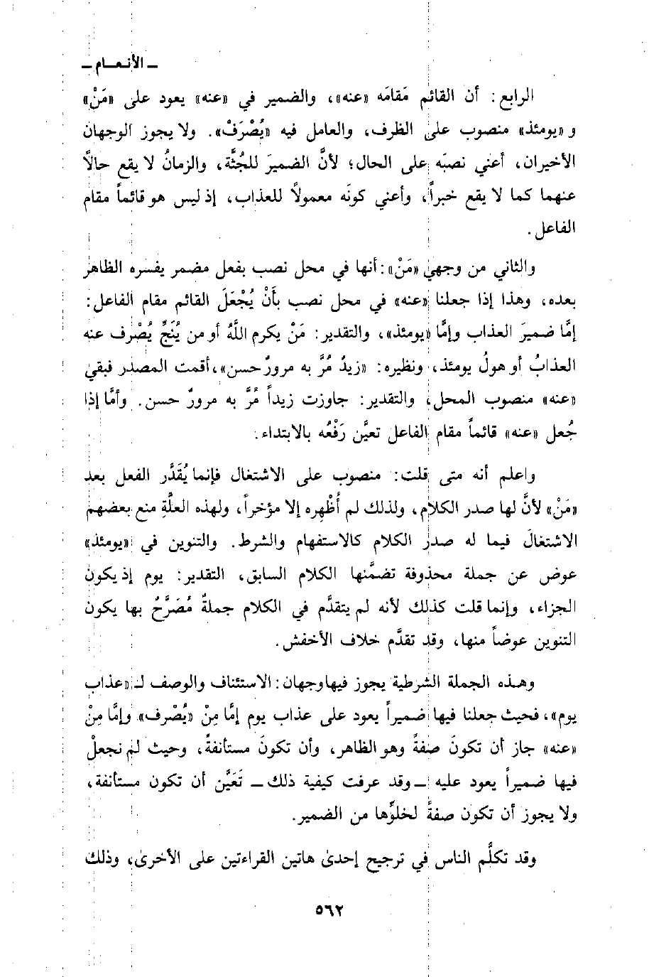 الرابع: أن القائم مَقامَه «عنه» والضمير في «عنه» يعود على «مَنْ» و «يومئذ» منصوب على الظرف، والعامل فيه «يُصْرَفْ» ولا يجوز الوجهان الأخيران، أعني نصبَه على الحال؛ لأنَّ الضميرَ للجُثَّة، والزمانُ لا يقع حالاً عنهما كما لا يقع خبراً، وأعني كونَه معمولاً للعذاب، إذ ليس هو قائماً مقام الفاعل.