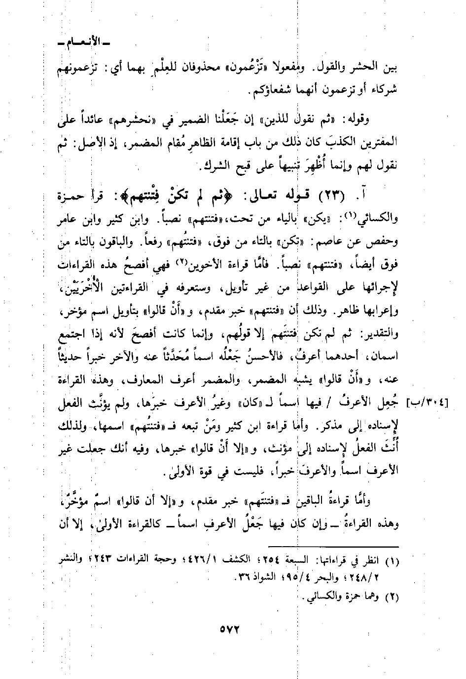 وأمَّا قراءةُ الباقين ف «فتنتَهم» خبر مقدم، و «إلا أن قالوا» اسمٌ مؤخَّرٌ، وهذه القراءةُ - وإن كان فيها جَعْلُ الأعرفِ اسماً - كالقراءة الأولى، إلا أن
