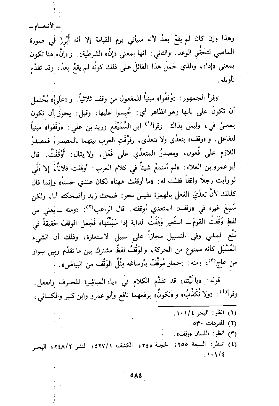 وقرأ الجمهور: {وُقِفُوا} مبنياً للمفعول من وقف ثلاثياً. و» على «يُحْتمل أن تكونَ على بابها وهو الظاهر أي: حُبِسوا عليها، وقيل: يجوز أن تكون بمعنى في، وليس بذاك. وقرأ ابن السَّمَيْفَع وزيد بن علي:» وَقَفوا «مبنياً للفاعل. و» وقف «يتعدَّى ولا يتعدَّى، وفرَّقَتِ العرب بينهما بالمصدر، فمصدرُ اللازم على فُعول، ومصدرُ المتعدِّي على فَعْل، ولا يقال: أَوْقَفْتُ. قال أبو عمرو بن العلاء:» لم أسمعْ شيئاً في كلام العرب: أوقفت فلاناً، إلا أَنِّي لو رأيت رجلاً واقفاً فقلت: له: «ما أوقفك ههنا» لكان عندي حسناً «وإنما قال كذلك لأنَّ تعدِّيَ الفعل بالهمزة مقيس نحو: ضحك زيد وأضحكته أنا، ولكن سَمِعَ غيره في» وقف «المتعدي أوقفته. قال الراغب:» ومنه - يعني من لفظِ وَقَفْتُ القومَ - استُعير وَقَفْتُ الدابة إذا سَبَلْتُها «فَجَعَل الوقفَ حقيقةً في مَنْع المشي وفي التسبيل مجازاً على سبيل الاستعارة، وذلك أن الشيء المُسْبَل كأنه ممنوع من الحركة، والوَقْفُ لفظُ مشترك بين ما تقدَّم وبين سِوار من عاج، ومنه:» حمار مُوَقَّفٌ بأرساغه مِثْلُ الوَقْف من البياض «.
