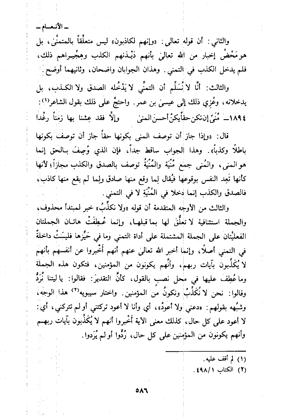قال:» وإذا جاز أن توصف المنى بكونها حقاً بجاز أن توصف بكونها باطلاً وكذباً «وهذا الجواب ساقط جداً، فإن الذي وُصِفَ بالحق إنما هو المنى، والمُنى جمع مُنْيَة والمُنْيَةُ توصف بالصدق والكذب مجازاً؛ لأنها كأنها تَعِد النفس بوقوعها فيُقال لِما وقع منها صادق ولِما لم يقع منها كاذب، فالصدق والكذب إنما دخلا في المُنْيَةِ لا في التمني.