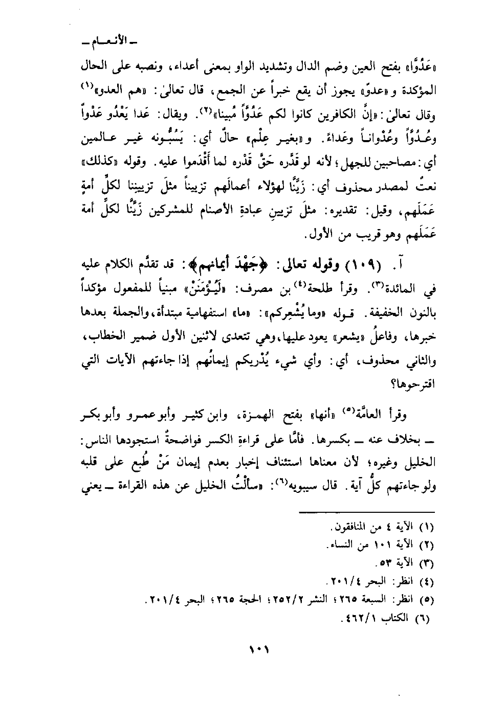 عَدُوَّا «بفتح العين وضم الدال وتشديد الواو بمعنى أعداء، ونصبه على الحال المؤكدة و» عدوّ «يجوز أن يقع خبراً عن الجمع، قال تعالى: {هُمُ العدو} [المنافقون: 4] وقال تعالى {إِنَّ الكافرين كَانُواْ لَكُمْ عَدُوّاً مُّبِيناً} [النساء: 101] . ويقال: عَدا يَعْدُوا عَدْواً وعُدُوَّاً وعُدْواناً وعَداءً. و» بغير عِلْم «حالٌ أي: يَسُبُّونه غير عالمين أي: مصاحبين للجهل؛ لأنه لو قَدَّره حَقَّ قَدْره لما أَقْدَموا عليه. وقوله» كذلك «نعتٌ لمصدر محذوف أي: زَيَّنَّا لهؤلاء أعمالَهم تزييناً مثلَ تزيينِنا لكلِّ أمةٍ عَمَلَهم، وقيل: تقديره: مثلَ تزيينِ عبادةِ الأصنام للمشركين زَيَّنَّا لكلِّ أمة عَمَلَهم وهو قريب من الأول.