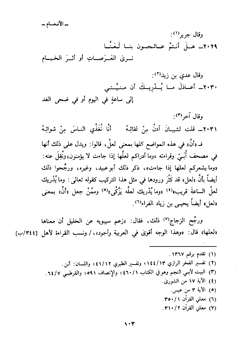ف «أنَّ» في هذه المواضع كلها بمعنى لعلَّ، قالوا: ويدل على ذلك أنها في مصحف أُبَيّ وقراءته «وما أدراكم لعلَّها إذا جاءت لا يؤمنون» ونُقِلَ عنه: {وَمَا يُشْعِرُكُمْ لعلها إِذَا جَآءَتْ} ، ذكر ذلك أبو عبيد، وغيره، ورجَّحوا ذلك أيضاً بأنَّ «لعل» قد كَثُرَ ورودها في مثل هذا التركيب كقوله تعالى: {وَمَا يُدْرِيكَ لَعَلَّ الساعة قَرِيبٌ} [الشورى: 17] {وَمَا يُدْرِيكَ لَعَلَّهُ يزكى} [عبس: 3] وممَّنْ جعل «أنَّ» بمعنى «لعل» أيضاً يحيى بن زياد الفراء.