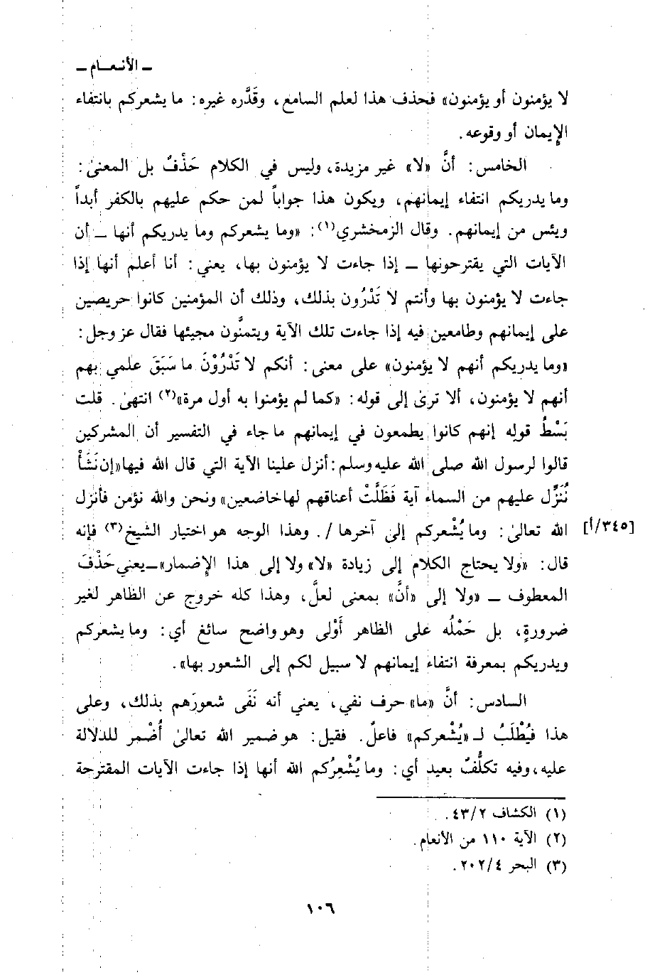 الخامس: أنَّ «لا» غير مزيدة، وليس في الكلام حَذْفٌ بل المعنى: وما يدريكم انتفاء إيمانهم، ويكون هذا جواباً لمن حكم عليهم بالكفر أبداً ويئس من إيمانهم. وقال الزمخشري: «وما يشعركم وما يدريكم أنها - أن الآيات التي يقترحونها - إذا جاءت لا يؤمنون بها، يعني: أنا أعلم أنها إذا جاءت لا يؤمنون بها وأنتم لا تَدْرُون بذلك، وذلك أن المؤمنين كانوا حريصين على إيمانهم وطامعين فيه إذا جاءت تلك الآية ويتمنَّون مجيئها فقال عز وجل:» وما يدريكم أنهم لا يؤمنون «على معنى: أنكم لا تَدْرُوْنَ ما سَبَقَ علمي بهم أنهم لا يؤمنون، ألا ترى إلى قوله: {كَمَا لَمْ يُؤْمِنُواْ بِهِ أَوَّلَ مَرَّةٍ} [الأنعام: 110] انتهى. قلت بَسْطُ قولِه إنهم كانوا يطمعون في إيمانهم ما جاء في التفسير أن المشركين قالوا لرسول الله صَلَّى اللهُ عَلَيْهِ وَسَلَّمَ: أنزل علينا الآية التي قال الله فيها {إِن نَّشَأْ نُنَزِّلْ عَلَيْهِمْ مِّنَ السمآء آيَةً فَظَلَّتْ أَعْنَاقُهُمْ لَهَا خَاضِعِينَ} ونحن والله نؤمن فأنزل الله تعالى: وما يُشْعركم إلى آخرها/. وهذا الوجه هو اختيار الشيخ فإنه قال:» ولا يحتاج الكلام إلى زيادة «لا» ولا إلى هذا الإِضمار «- يعني حَذْفَ المعطوف -» ولا إلى «أنَّ» بمعنى لعلَّ، وهذا كله خروج عن الظاهر لغير ضرورةٍ، بل حَمْلُه على الظاهر أَوْلى وهو واضح سائغ أي: وما يشعركم ويدريكم بمعرفة انتفاء إيمانهم لا سبيل لكم إلى الشعور بها «.