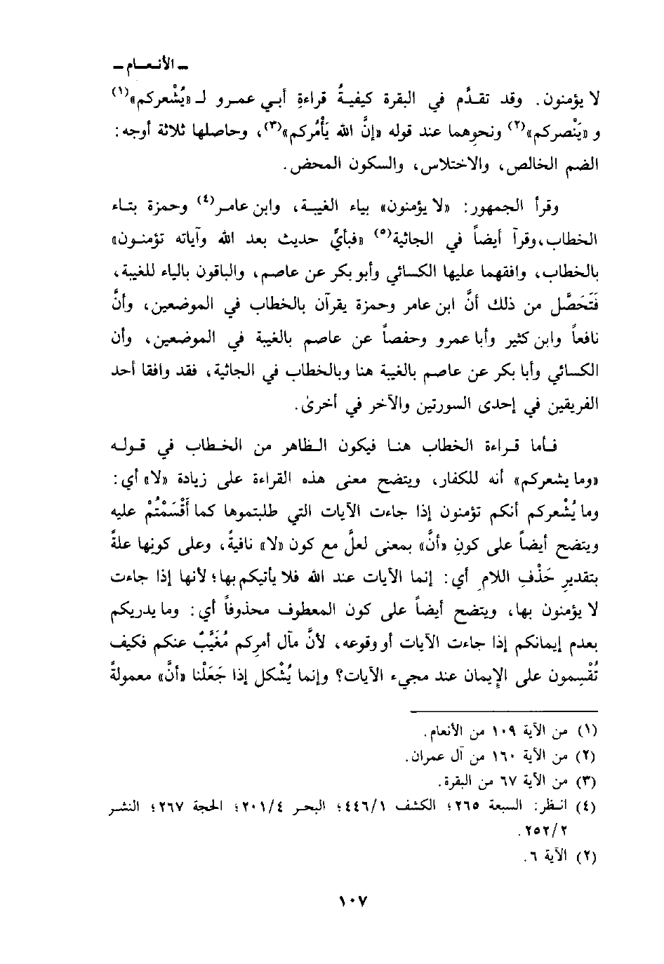 فأما قراءة الخطاب هنا فيكون الظاهر من الخطاب في قوله «وما يشعركم» أنه للكفار، ويتضح معنى هذه القراءة على زيادة «لا» أي: وما يُشْعركم أنكم تؤمنون إذا جاءت الآيات التي طلبتموها كما أَقْسَمْتُمْ عليه ويتضح أيضاً على كونِ «أنَّ» بمعنى لعلَّ مع كون «لا» نافيةً، وعلى كونِها علةً بتقديرِ حَذْفِ اللامِ أي: إنما الآيات عند الله فلا يأتيكم بها؛ لأنها إذا جاءت لا يؤمنون بها، ويتضح أيضاً على كون المعطوف محذوفاً أي: وما يدريكم بعدم إيمانكم إذا جاءت الآيات أو وقوعه، لأنَّ مآل أمرِكم مُغَيَّبٌ عنكم فكيف تُقْسِمون على الإِيمان عند مجيء الآيات؟ وإنما يُشْكل إذا جَعَلْنا «أنَّ» معمولةً