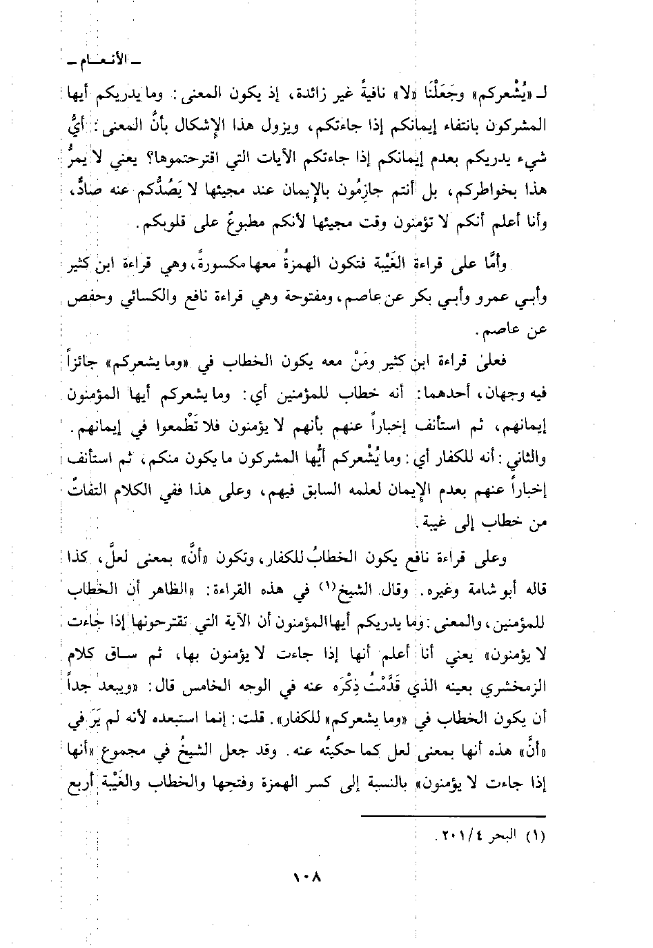 ل «يُشْعركم» وجَعَلْنَا «لا» نافيةً غير زائدة، إذ يكون المعنى: وما يدريكم أيها المشركون بانتفاء إيمانكم إذا جاءتكم، ويزول هذا الإِشكال بأنَّ المعنى: أيُّ شيء يدريكم بعدم إيمانكم إذا جاءتكم الآيات التي اقترحتموها؟ يعني لا يمرُّ هذا بخواطركم، بل أنتم جازِمُون بالإِيمان عند مجيئها لا يَصُدُّكم عنه صادٌّ، وأنا أعلم أنكم لا تؤمنون وقت مجيئها لأنكم مطبوعٌ على قلوبكم.