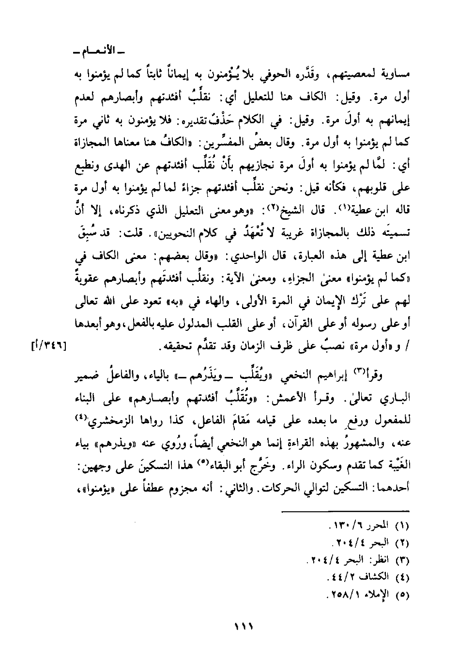 وقرأ إبراهيم النخعي» ويُقَلِّب ويَذَرُهم «بالياء، والفاعلُ ضمير الباري تعالى. وقرأ الأعمش:» وتُقَلَّبُ أفئدتهم وأبصارهم «على البناء للمفعول ورفعِ ما بعده على قيامه مَقامَ الفاعل، كذا رواها الزمخشري عنه، والمشهورُ بهذه القراءةِ إنما هو النخعي أيضاً، ورُوي عنه» ويذرهم «بياء الغَيْبة كما تقدم وسكون الراء. وخَرَّج أبو البقاء هذا التسكينَ على وجهين: أحدهما: التسكين لتوالي الحركات. والثاني: أنه مجزوم عطفاً على» يؤمنوا «،