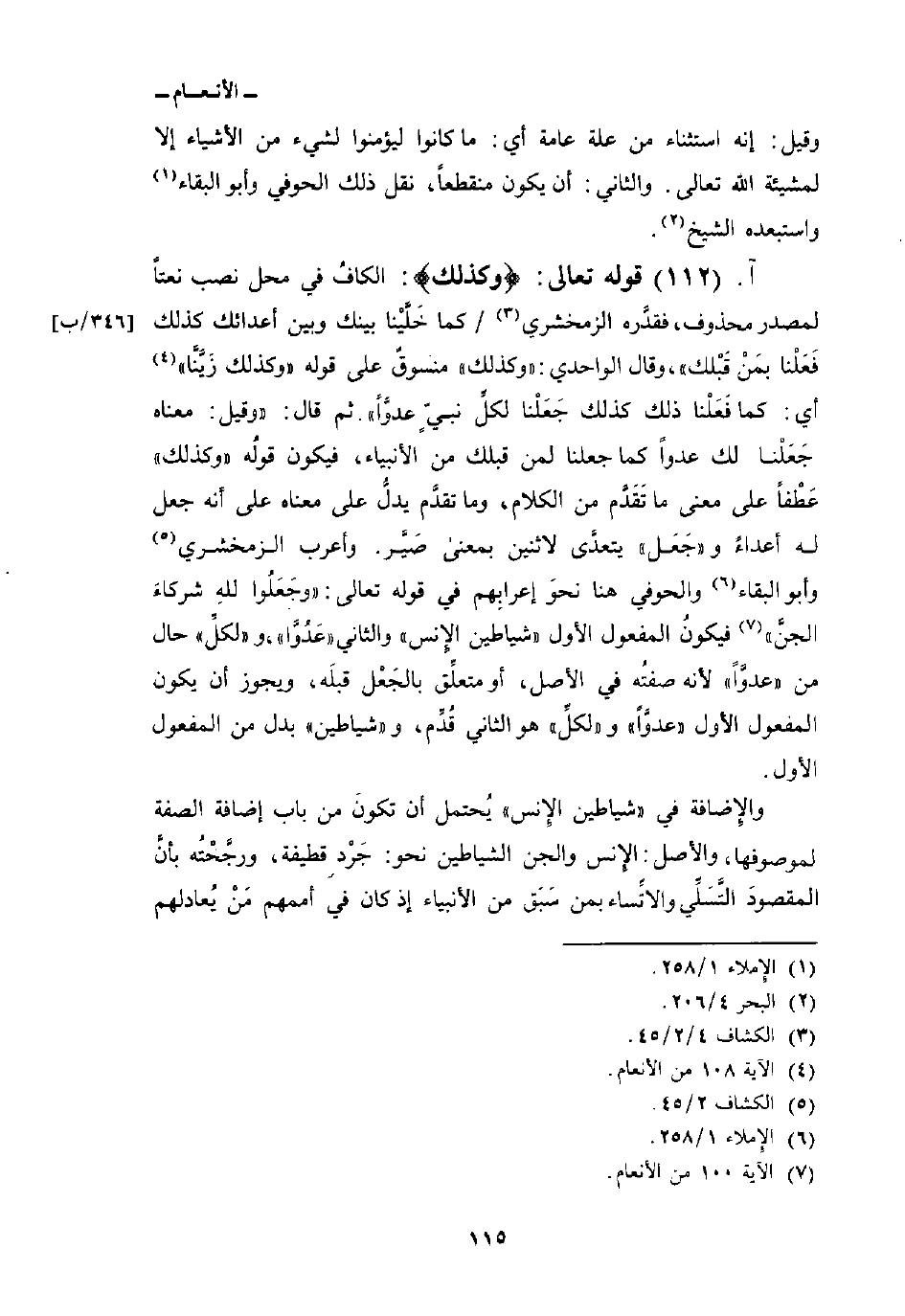 قوله تعالى: {وَكَذَلِكَ} : الكافُ في محل نصب نعتاً لمصدر محذوف، فقدَّره الزمخشري/ كما خَلَّيْنا بينك وبين أعدائك كذلك فَعَلْنا بمَنْ قَبْلك «، وقال الواحدي:» وكذلك «منسوقٌ على قوله {كَذَلِكَ زَيَّنَّا} [الأنعام: 108] أي:» كما فَعَلْنا ذلك كذلك جَعَلْنا لكلِّ نبيٍّ عدوَّاً «. ثم قال:» وقيل: معناه جَعَلْنا لك عدواً كما جعلنا لمن قبلك من الأنبياء، فيكون قولُه «وكذلك» عَطْفاً على معنى ما تَقَدَّم من الكلام، وما تقدَّم يدلُّ على معناه على أنه جعل له أعداءً و «جَعَل» يتعدَّى لاثنين بمعنى صَيَّر. وأعرب الزمخشري وأبو البقاء والحوفي هنا نحوَ إعرابِهم في قوله تعالى: {وَجَعَلُواْ للَّهِ شُرَكَآءَ الجن} [الأنعام: 100] فيكونُ المفعول الأول «شياطين الإِنس» والثاني «عَدُوَّا» ، و «لكلِّ» حال من «عدوَّاً» لأنه صفتُه في الأصل، أو متعلِّق بالجَعْل قبلَه، ويجوز أن يكون المفعول الأول «عدوَّاً» و «لكلِّ» هو الثاني قُدِّم، و «شياطين» بدل من المفعول الأول.