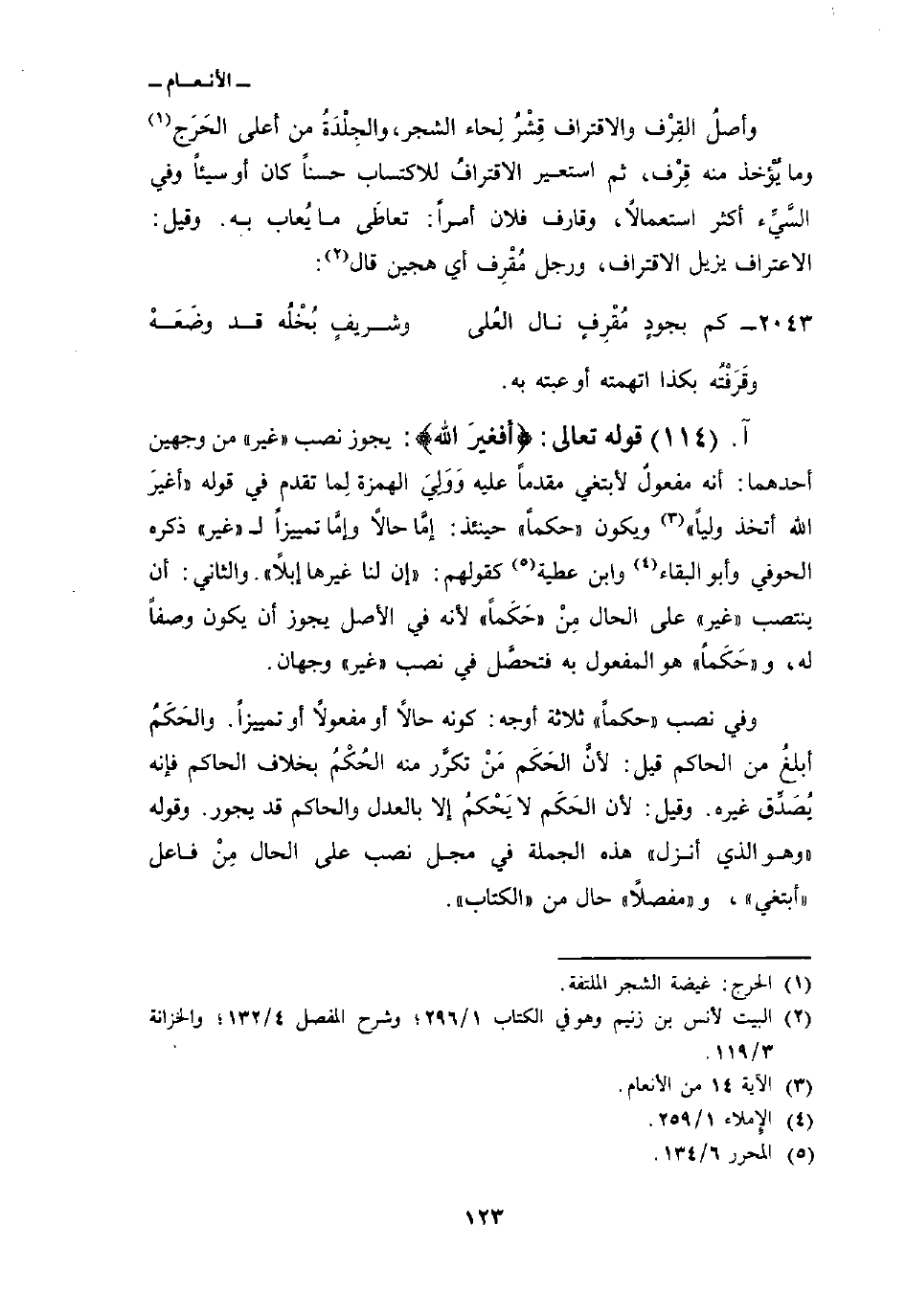 وفي نصب «حكماً» ثلاثة أوجه: كونه حالاً أو مفعولاً أو تمييزاً. والحَكَمُ أبلغُ من الحاكم قيل: لأنَّ الحَكَم مَنْ تكرَّر منه الحُكْمُ بخلاف الحاكم فإنه يُصَدِّق غيره. وقيل: لأن الحَكَم لا يَحْكمُ إلا بالعدل والحاكم قد يجور. وقوله «وهو الذي أنزل» هذه الجملة في محل نصب على الحال مِنْ فاعل «أبتغي» ، و «مفصلاً» حال من «الكتاب» .