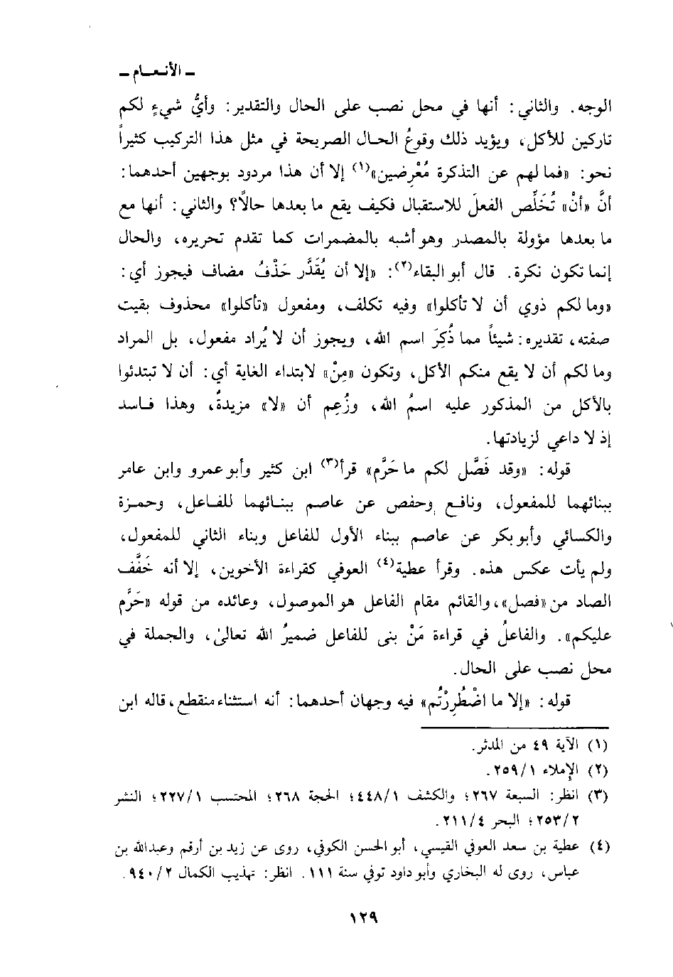 قوله: {وَقَدْ فَصَّلَ لَكُمْ مَّا حَرَّمَ} قرأ ابن كثير وأبو عمرو وابن عامر ببنائهما للمفعول، ونافع وحفص عن عاصم ببنائهما للفاعل، وحمزة والكسائي وأبو بكر عن عاصم ببناء الأول للفاعل وبناء الثاني للمفعول، ولم يأت عكس هذه. وقرأ عطية العوفي كقراءة الأخوين، إلا أنه خَفَّف الصاد من» فصل «، والقائم مقام الفاعل هو الموصول، وعائده من قوله» حَرَّم عليكم «. والفاعلُ في قراءة مَنْ بنى للفاعل ضميرُ الله تعالى، والجملة في محل نصب على الحال.