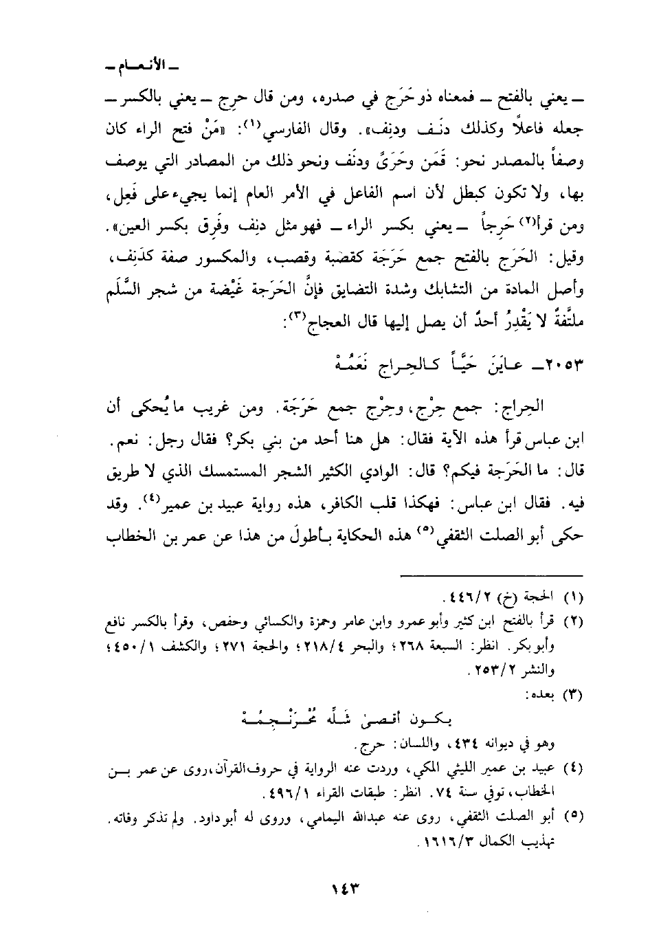 2053 - عايَنَ حَيَّاً كالحِراج نَعَمُهْ ... الحِراج: جمع حِرْج، وحِرْج جمع حَرَجة. ومن غريب ما يُحكى أن ابن عباس قرأ هذه الآية فقال: هل هنا أحد من بني بكر؟ فقال رجل: نعم. قال: ما الحَرَجة فيكم؟ قال: الوادي الكثير الشجر المستمسك الذي لا طريق فيه. فقال ابن عباس: فهكذا قلب الكافر، هذه رواية عبيد بن عمير. وقد حكى أبو الصلت الثقفي هذه الحكاية بأطولَ من هذا عن عمر بن الخطاب