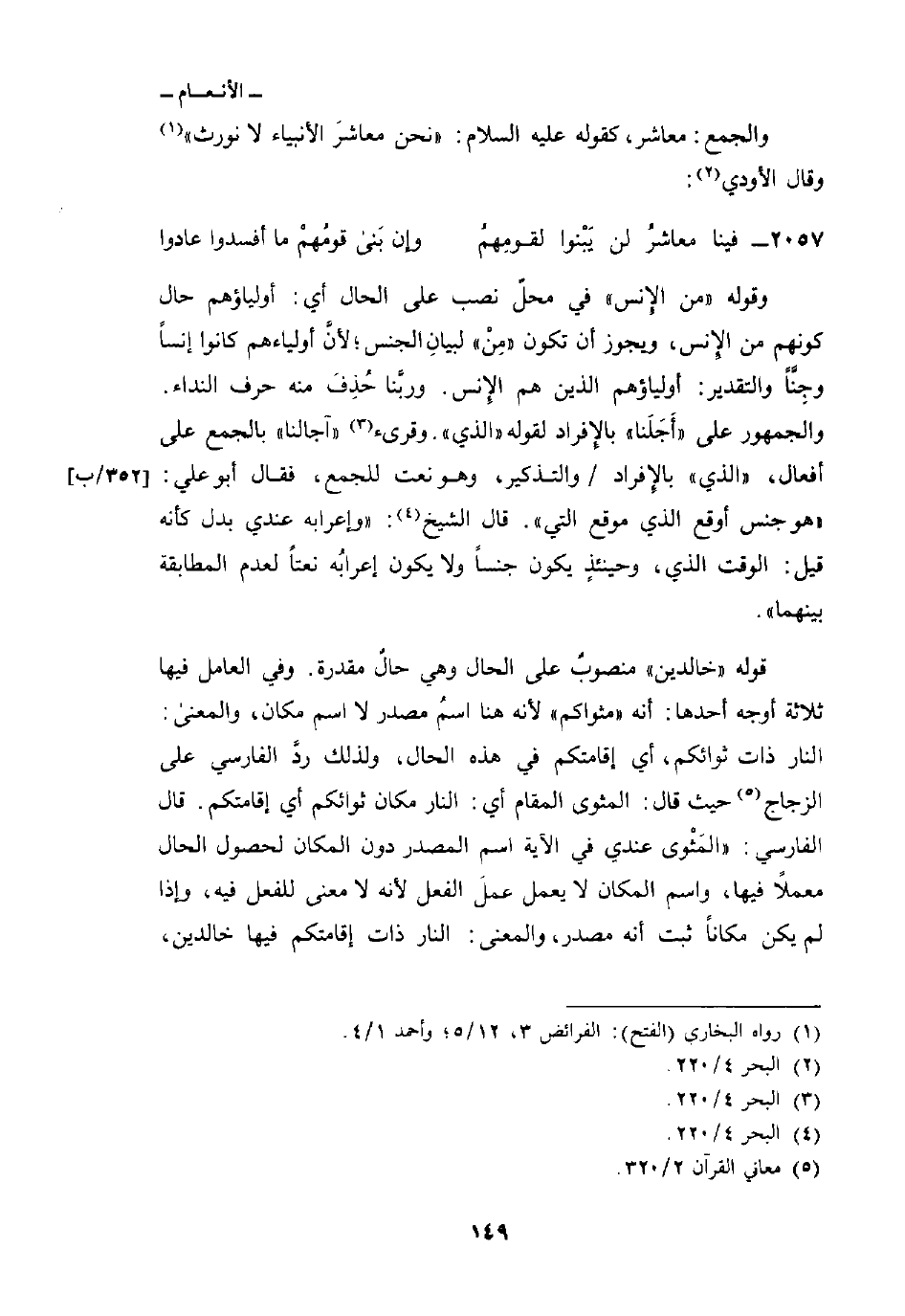 قوله» خَالِدِينَ «منصوبٌ على الحال وهي حالٌ مقدرة. وفي العامل فيها ثلاثة أوجه أحدها: أنه» مثواكم «لأنه هنا اسمُ مصدر لا اسم مكان، والمعنى: النار ذات ثوائكم، أي إقامتكم في هذه الحال، ولذلك ردَّ الفارسي على الزجاج حيث قال: المثوى المقام أي: النار مكان ثوائكم أي إقامتكم. قال الفارسي:» المَثْوى عندي في الآية اسم المصدر دون المكان لحصول الحال معملاً فيها، واسم المكان لا يعمل عملَ الفعل لأنه لا معنى للفعل فيه، وإذا لم يكن مكاناً ثبت أنه مصدر، والمعنى: النار ذات إقامتكم فيها خالدين،