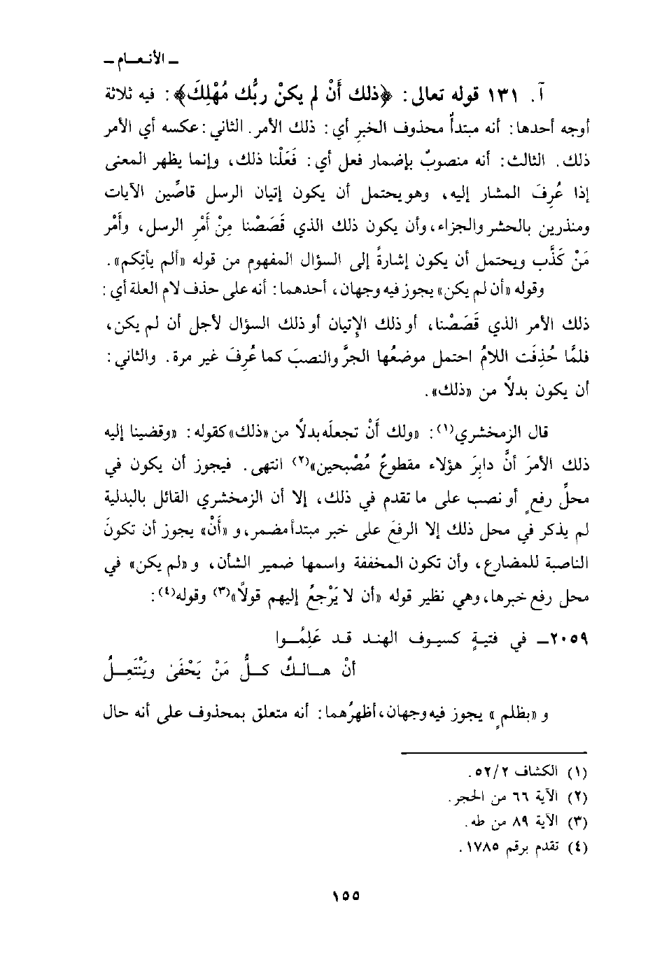 قوله تعالى: {ذلك أَن لَّمْ يَكُنْ رَّبُّكَ مُهْلِكَ} : فيه ثلاثة أوجه أحدها: أنه مبتدأٌ محذوف الخبرِ أي: ذلك الأمر. الثاني: عكسه أي الأمر ذلك. الثالث: أنه منصوبٌ بإضمار فعل أي: فَعَلْنا ذلك، وإنما يظهر المعنى إذا عُرِفَ المشار إليه، وهو يحتمل أن يكون إتيان الرسل قاصِّين الآيات ومنذرين بالحشر والجزاء، وأن يكون ذلك الذي قَصَصْنا مِنْ أَمْرِ الرسل، وأَمْر مَنْ كَذَّب ويحتمل أن يكون إشارةً إلى السؤال المفهوم من قوله «ألم يأتكم» .