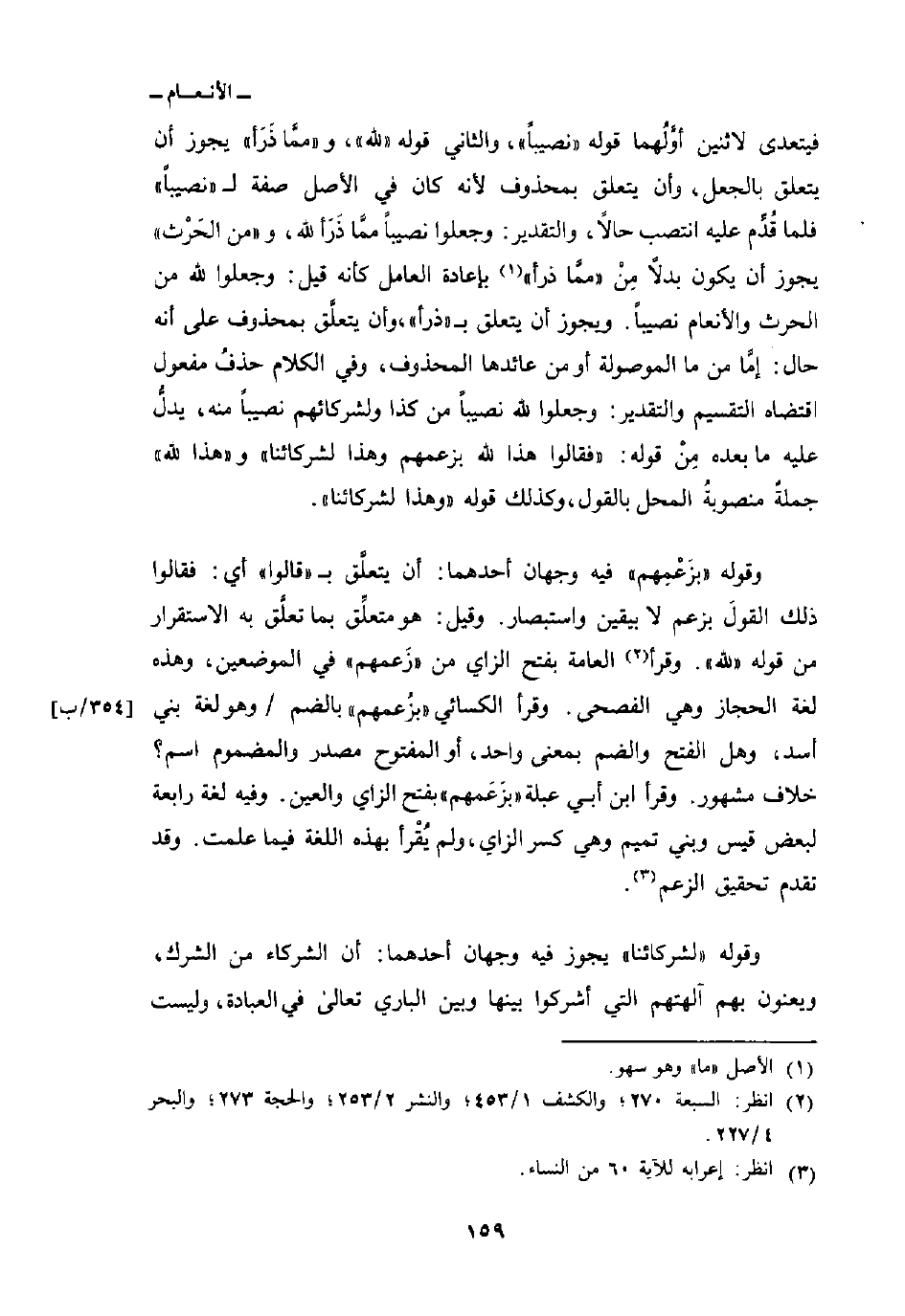 فيتعدى لاثنين أوَّلُهما قوله «نصيباً» ، والثاني قوله «لله» ، و «ممَّا ذَرَأ» يجوز أن يتعلق بالجعل، وأن يتعلق بمحذوف لأنه كان في الأصل صفة ل «نصيباً» فلما قُدِّم عليه انتصب حالاً، والتقدير: وجعلوا نصيباً ممَّا ذَرَأ لله، و «من الحَرْث» يجوز أن يكون بدلاً مِنْ «ممَّا ذرأ» بإعادة العامل كأنه قيل: وجعلوا لله من الحرث والأنعام نصيباً. ويجوز أن يتعلق ب «ذرأ» ، وأن يتعلَّق بمحذوف على أنه حال: إمَّا من ما الموصولة أو من عائدها المحذوف، وفي الكلام حذفُ مفعول اقتضاه التقسيم والتقدير: وجعلوا لله نصيباً من كذا ولشركائهم نصيباً منه، يدلُّ عليه ما بعده مِنْ قوله: {فَقَالُواْ هذا للَّهِ بِزَعْمِهِمْ وهذا} و «هذا لله» جملةٌ منصوبةُ المحل بالقول، وكذلك قوله «وهذا لشركائنا» .