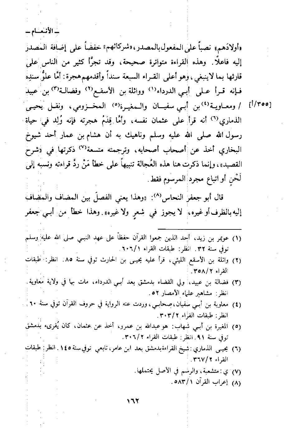 أولادَهم «نصباً على المفعول بالمصدر،» شركائهم «خفضاً على إضافة المصدر إليه فاعلاً. وهذه القراءة متواترة صحيحة، وقد تجرَّأ كثير من الناس على قارئها بما لا ينبغي، وهو أعلى القراء السبعة سنداً وأقدمهم هجرة: أمَّا علوُّ سندِه فإنه قرأ على أبي الدرداء وواثلة بن الأسقع وفضالة بن عبيد ومعاوية بن أبي سفيان والمغيرة المخزومي، ونقل يحيى الذماري أنه قرأ على عثمان نفسه، وأمَّا قِدَمُ هجرته فإنه وُلِد في حياة رسول الله صَلَّى اللهُ عَلَيْهِ وَسَلَّمَ وناهيك به أن هشام بن عمار أحد شيوخ البخاري أخذ عن أصحاب أصحابه، وترجمته متسعة ذكرتها في» شرح القصيد «، وإنما ذكرت هنا هذه العُجالة تنبيهاً على خطأ مَنْ ردَّ قراءته ونسبه إلى لَحْنٍ أو اتباع مجرد المرسوم فقط.