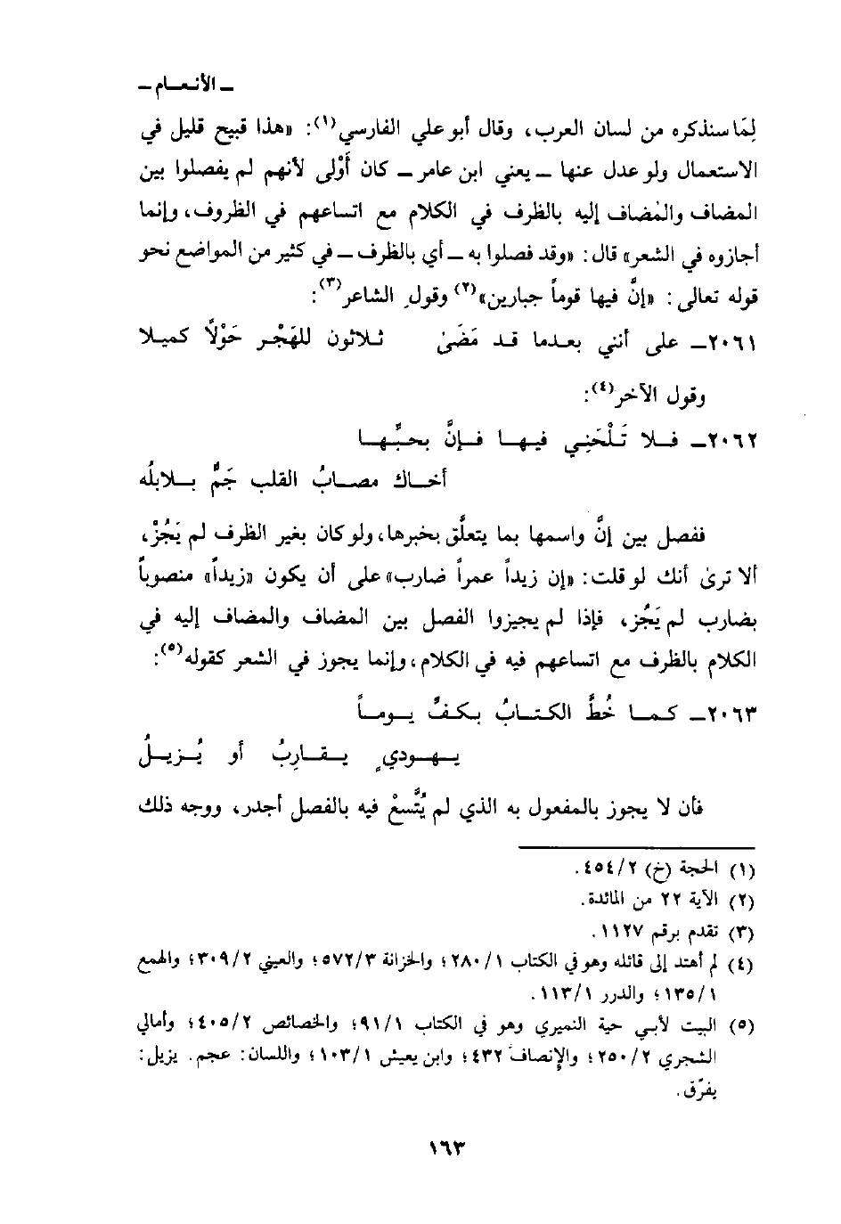 ففصل بين إنَّ واسمها بما يتعلَّق بخبرها، ولو كان بغير الظرف لم يَجُزْ، ألا ترى أنك لو قلت: «إن زيداً عمراً ضارب» على أن يكون «زيداً» منصوباً بضارب لم يَجُز، فإذا لم يجيزوا الفصل بين المضاف والمضاف إليه في الكلام بالظرف مع اتساعهم فيه في الكلام، وإنما يجوز في الشعر كقوله: