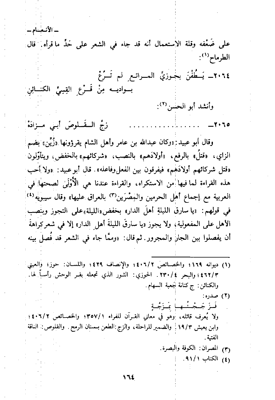 وقال أبو عبيد: «وكان عبد الله بن عامر وأهل الشام يقرؤونها» زُيِّن «بضم الزاي،» قتلُ «بالرفع،» أولادَهم «بالنصب،» شركائهم «بالخفض، ويتأوّلون» قتل شركائهم أولادَهم «فيفرقون بين الفعل وفاعله» . قال أبو عبيد: «ولا أحب هذه القراءة لما فيها من الاستكراه، والقراءة عندنا هي الأَوْلَى لصحتها في العربية مع إجماع أهل الحرمين والمِصْرَين بالعراق عليها» وقال سيبويه في قولهم «» يا سارق الليلةِ أهلَ الدار «بخفض» الليلة «على التجوز وبنصب الأهل على المفعولية، ولا يجوز» يا سارقَ الليلةَ أهلِ الدار «إلا في شعر كراهةَ أن يفصلوا بين الجار والمجرور. ثم قال:» وممَّا جاء في الشعر قد فُصل بينه