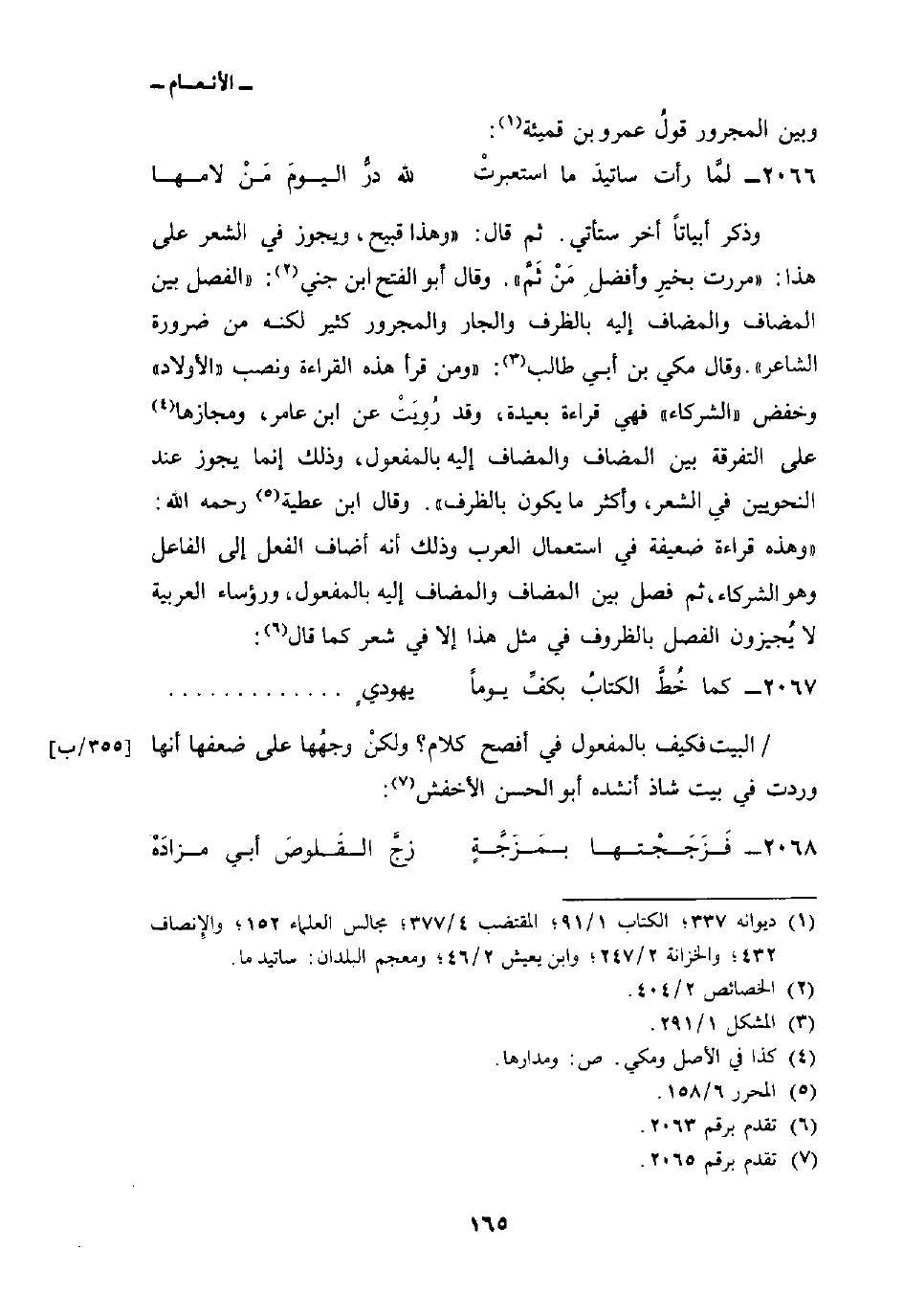 وذكر أبياتاً أخر ستأتي. ثم قال: «وهذا قبيح، ويجوز في الشعر على هذا:» مررت بخيرِ وأفضلِ مَنْ ثَمَّ «. وقال أبو الفتح ابن جني:» الفصل بين المضاف والمضاف إليه بالظرف والجار والمجرور كثير لكنه من ضرورة الشاعر «. وقال مكي بن أبي طالب:» ومن قرأ هذه القراءة ونصب «الأولاد» وخفض «الشركاء» فهي قراءة بعيدة، وقد رُوِيَتْ عن ابن عامر، ومجازها على التفرقة بين المضاف والمضاف إليه بالمفعول، وذلك إنما يجوز عند النحويين في الشعر، وأكثر ما يكون بالظرف «. وقال ابن عطية رحمه الله:» وهذه قراءة ضعيفة في استعمال العرب وذلك أنه أضاف الفعل إلى الفاعل وهو الشركاء، ثم فصل بين المضاف والمضاف إليه بالمفعول، ورؤساء العربية لا يُجيزون الفصل بالظروف في مثل هذا إلا في شعر كما قال:
