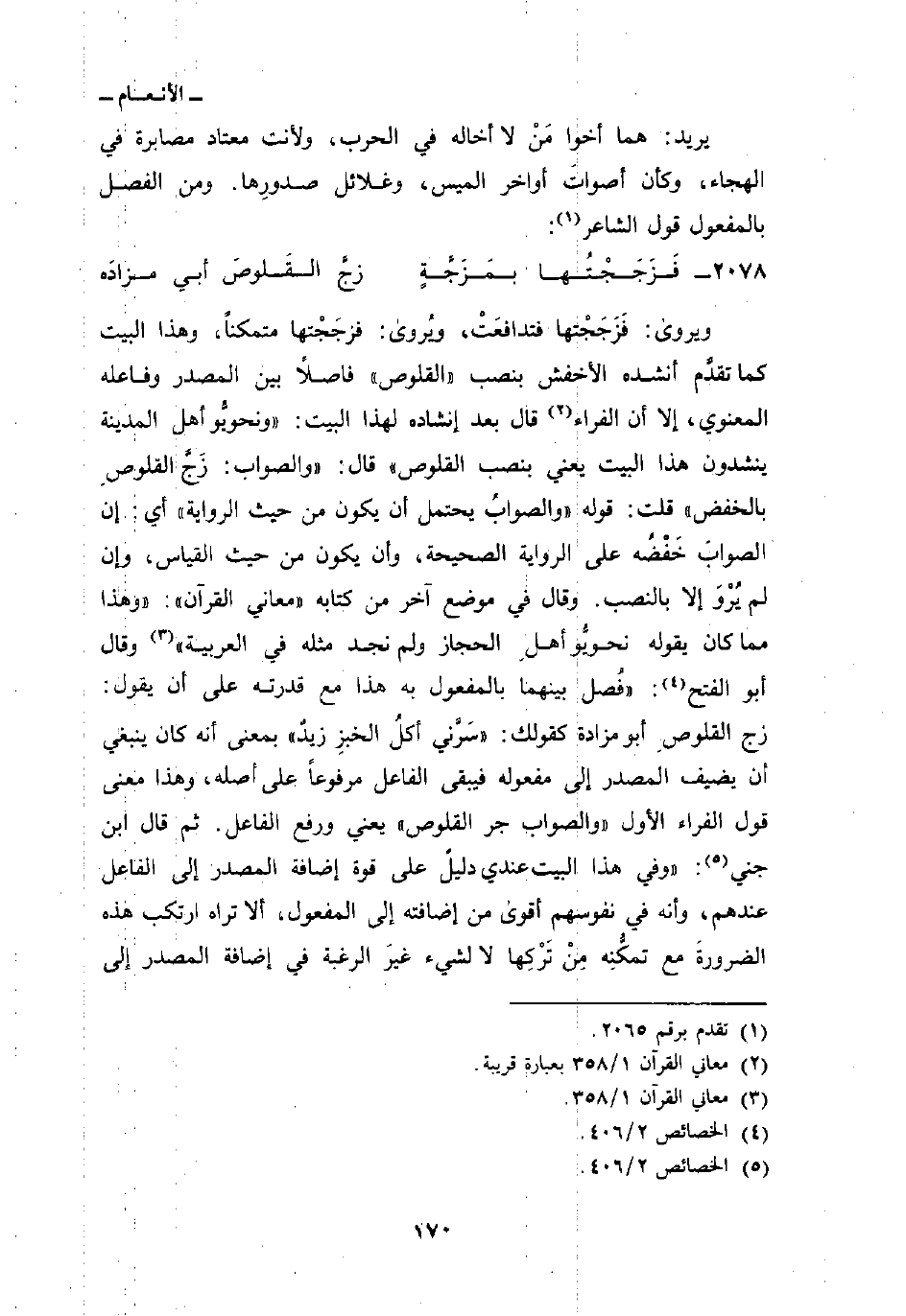 ويروى: فَزَجَجْتها فتدافعَتْ، ويُروى: فزجَجْتها متمكناً، وهذا البيت كما تقدَّم أنشده الأخفش بنصب «القلوص» فاصلاً بين المصدر وفاعله المعنوي، إلا أن الفراء قال بعد إنشاده لهذا البيت: «ونحويُّو أهل المدينة ينشدون هذا البيت يعني بنصب القلوص» قال: «والصواب: زَجَّ القلوصِ بالخفض» قلت: قوله «والصوابُ يحتمل أن يكون من حيث الرواية، أي: إن الصوابَ خَفْضُه على الرواية الصحيحة، وأن يكون من حيث القياس، وإن لم يُرْوَ إلا بالنصب. وقال في موضع آخر من كتابه» معاني القرآن «:» وهذا مما كان يقوله نحويُّو أهلِ الحجاز ولم نجد مثله في العربية «وقال أبو الفتح:» فُصل بينهما بالمفعول به هذا مع قدرته على أن يقول: زج القلوصِ أبو مزادة كقولك: «سَرَّني أكلُ الخبزِ زيدٌ» بمعنى أنه كان ينبغي أن يضيف المصدر إلى مفعوله فيبقى الفاعل مرفوعاً على أصله، وهذا معنى قول الفراء الأول «والصواب جر القلوص» يعني ورفع الفاعل. ثم قال ابن جني: «وفي هذا البيت عندي دليلٌ على قوة إضافة المصدر إلى الفاعل عندهم، وأنه في نفوسهم أقوى من إضافته إلى المفعول، ألا تراه ارتكب هذه الضرورةَ مع تمكُّنِه مِنْ تَرْكِها لا لشيء غيرَ الرغبة في إضافة المصدر إلى