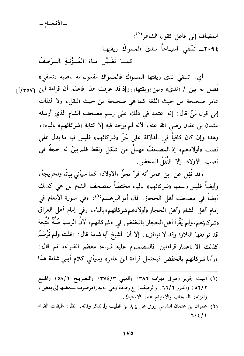 وقد نُقِل عن ابن عامر أنه قرأ بجرَِّ» الأولاد «كما سيأتي بيانُه وتخريجهُ، وأيضاً فليس رسمها» شركائهم «بالياء مختصَّاً بمصحف الشام بل هي كذلك أيضاً في مصحف أهل الحجاز. قال أبو البرهسم:» في سورة الأنعام في إمام أهل الشام وأهل الحجاز «أولادهم شركائهم» بالياء، وفي إمام أهل العراق «شركاؤهم» ولم يَقْرأ أهل الحجاز بالخفض في «شركائهم» لأنَّ الرسمَ سُنَّةٌ مُتَّبعة قد توافقها التلاوة وقد لا توافق «. إلا أن الشيخ أبا شامة قال:» قلت ولم تُرْسَمُ كذلك إلا باعتبار قراءتين: فالمضموم عليه قراءة معظم القراء «ثم قال:» وأما شركائهم بالخفض فيحتمل قراءة ابن عامر «وسيأتي كلام أبي شامة هذا
