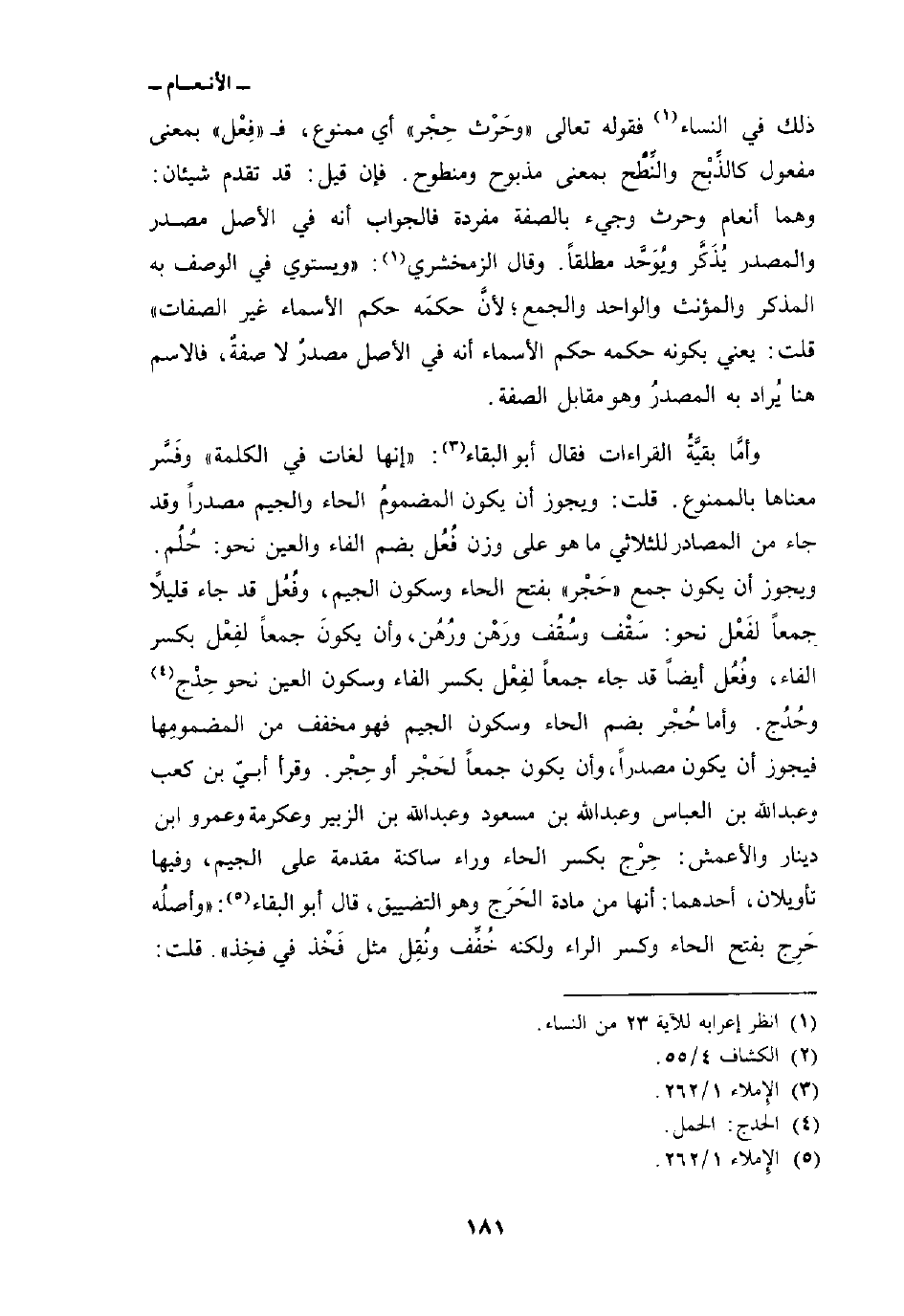 ذلك في النساء فقوله تعالى {وَحَرْثٌ حِجْرٌ} أي ممنوع، ف» فِعْل «بمعنى مفعول كالذِّبْح والنِّطْح بمعنى مذبوح ومنطوح. فإن قيل: قد تقدم شيئان: وهما أنعام وحرث وجيء بالصفة مفردة فالجواب أنه في الأصل مصدر والمصدر يُذَكَّر ويُوَحَّد مطلقاً. وقال الزمخشري:» ويستوي في الوصف به المذكر والمؤنث والواحد والجمع؛ لأنَّ حكمَه حكم الأسماء غير الصفات «قلت: يعني بكونه حكمه حكم الأسماء أنه في الأصل مصدرٌ لا صفةٌ، فالاسم هنا يُراد به المصدرُ وهو مقابل الصفة.
