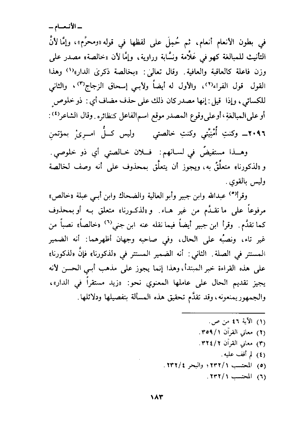 في بطون الأنعام أنعام، ثم حُمِلَ على لفظها في قوله «ومحرَّم» ، وإمَّا لأنَّ التأنيث للمبالغة كهو في عَلاَّمة ونسَّابة وراوية، وإمَّا لأن «خالصة» مصدر على وزن فاعلة كالعاقبة والعافية. وقال تعالى: {بِخَالِصَةٍ ذِكْرَى الدار} [ص: 46] وهذا القول قول الفراء، والأول له أيضاً ولأبي إسحاق الزجاج، والثاني للكسائي، وإذا قيل: إنها مصدر كان ذلك على حذف مضاف أي: ذو خلوصٍ أو على المبالغةِ، أو على وقوع المصدر موقع اسم الفاعل كنظائره. وقال الشاعر: