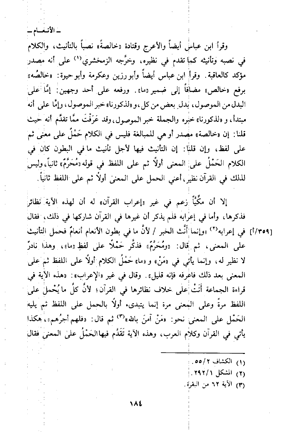 إلا أن مكِّيَّاً زعم في غير «إعراب القرآن» له أن لهذه الآية نظائر فذكرها، وأما في إعرابه فلم يذكر أن غيرها في القرآن شاركها في ذلك، فقال في إعرابه «وإنما أَنَّث الخبر/ لأنَّ ما في بطون الأنعام أنعامٌ فحمل التأنيث على المعنى، ثم قال:» ومُحَرَّمٌ «فذكَّر حَمْلاً على لفظِ» ما «، وهذا نادرٌ لا نظير له، وإنما يأتي في» مَنْ «و» ما «حَمْلُ الكلام أولاً على اللفظ ثم على المعنى بعد ذلك فاعرفه فإنه قليل» . وقال في غير «الإِعراب» : «هذه الآية في قراءة الجماعة أَتَتْ على خلاف نظائرها في القرآن؛ لأنَّ كلَّ ما يُحْمل على اللفظ مرةً وعلى المعنى مرة إنما يتبدئ أولاً بالحمل على اللفظ ثم يليه الحَمْل على المعنى نحو: {مَنْ آمَنَ بالله} [البقرة: 62] ثم قال:» فلهم أجرُهم «، هكذا يأتي في القرآن وكلام العرب، وهذه الآية تَقَدَّم فيها الحَمْلُ على المعنى فقال»