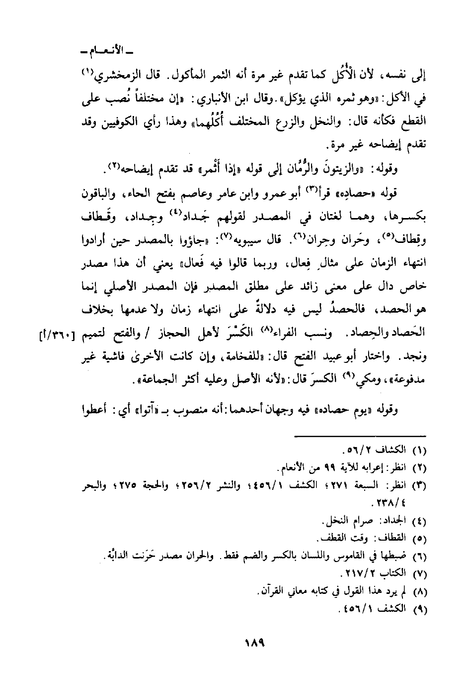 قوله «حصادِه» قرأ أبو عمرو وابن عامر وعاصم بفتح الحاء، والباقون بكسرها، وهما لغتان في المصدر لقولهم جَداد وجِداد، وقَطاف وقِطاف، وحَران وحِران. قال سيبويه: «جاؤوا بالمصدر حين أرادوا انتهاء الزمان على مثالِ فِعال، وربما قالوا فيه فَعال» يعني أن هذا مصدر خاص دال على معنى زائد على مطلق المصدر فإن المصدر الأصلي إنما هو الحصد، فالحصدُ ليس فيه دلالةٌ على انتهاء زمان ولا عدمها بخلاف الحَصاد والحِصاد.