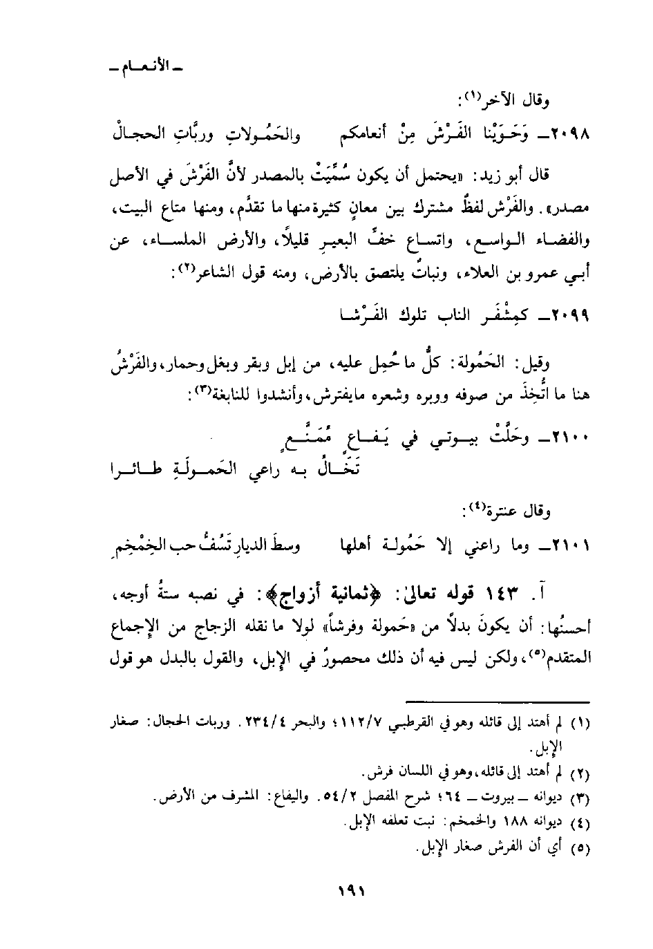 2099 - كمِشْفَر الناب تلوك الفَرْشا ... وقيل: الحَمُولة: كلُّ ما حُمِل عليه، من إبل وبقر وبغل وحمار، والفَرْشُ هنا ما اتُّخِذَ من صوفه ووبره وشعره ما يفترش، وأنشدوا للنابغة: