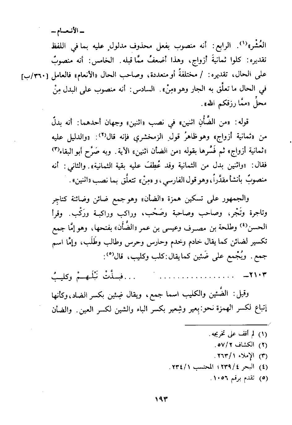 والجمهور على تسكين همزة «الضأن» وهو جمع ضائن وضائنة كتاجِر وتاجرة وتَجْر، وصاحب وصاحبة وصَحْب، وراكب وراكبة ورَكْب. وقرأ الحسن وطلحة بن مصرف وعيسى بن عمر «الضَّأَن» بفتحها، وهو إمَّا جمع تكسير لضائن كما يقال خادم وخدم وحارس وحرس وطالب وطَلَب، وإمَّا اسم جمع. ويُجْمع على ضَئين كما يقال: كلب وكليب، قال: