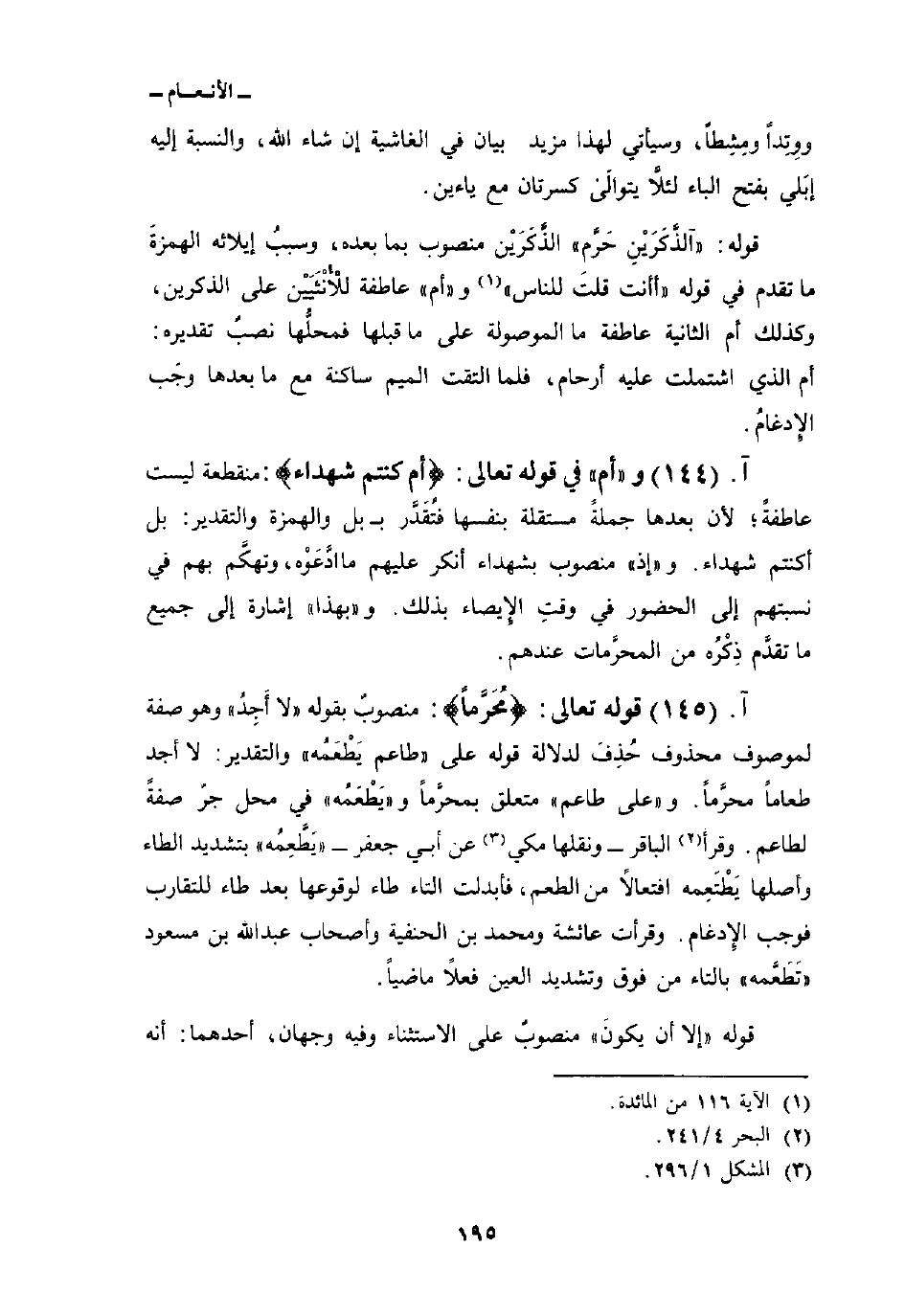 قوله: {ءَآلذَّكَرَيْنِ حَرَّمَ} الذَّكَرَيْن منصوب بما بعده، وسببُ إيلائه الهمزةَ ما تقدم في قوله «أأنت قلتَ للناس» و «أم» عاطفة للأُنْثَيَيْن على الذكرين، وكذلك أم الثانية عاطفة ما الموصولة على ما قبلها فمحلُّها نصبٌ تقديره: أم الذي اشتملت عليه أرحام، فلما التقت الميم ساكنة مع ما بعدها وجَب الإِدغامُ.