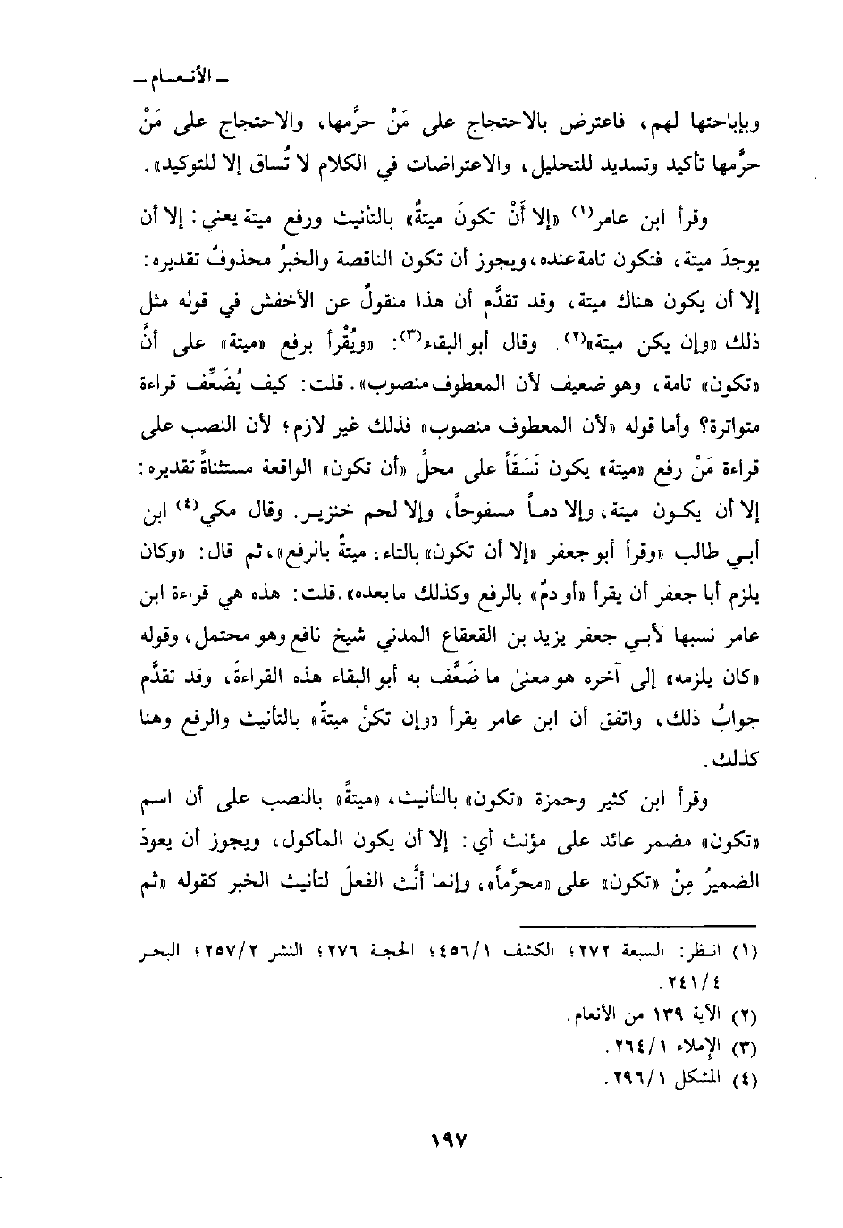وقال أبو البقاء: «ويُقْرأ برفع» ميتة «على أنَّ» تكون «تامة، وهو ضعيف لأن المعطوف منصوب» . قلت: كيف يُضَعِّف قراءة متواترة؟ وأما قوله «لأن المعطوف منصوب» فذلك غير لازم؛ لأن النصب على قراءة مَنْ رفع «ميتة» يكون نَسَقَاً على محلِّ «أن تكون» الواقعة مستثناةً تقديره: إلا أن يكون ميتة، وإلا دماً مسفوحاً، وإلا لحم خنزير. وقال مكي ابن أبي طالب «وقرأ أبو جعفر» إلا أن تكون «بالتاء، ميتةٌ بالرفع» ، ثم قال: «وكان يلزم أبا جعفر أن يقرأ» أو دمٌ «بالرفع وكذلك ما بعده» . قلت: هذه هي قراءة ابن عامر نسبها لأبي جعفر يزيد بن القعقاع المدني شيخ نافع وهو محتمل، وقوله «كان يلزمه» إلى آخره هو معنى ما ضَعَّف به أبو البقاء هذه القراءةَ، وقد تقدَّم جوابُ ذلك، واتفق أن ابن عامر يقرأ «وإن تكنْ ميتةٌ» بالتأنيث والرفع وهنا كذلك.