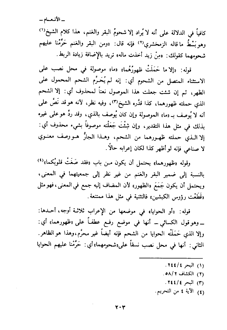 كافياً في الدلالة على أنه لا يُراد إلا شحومُ البقر والغنم، هذا كلام الشيخ وهو بَسْطُ ما قاله الزمخشري فإنه قال: «ومن البقر والغنم حَرَّمْنا عليهم شحومهما كقولك:» مِنْ زيد أخذت ماله «تريد بالإِضافة زيادة الربط.