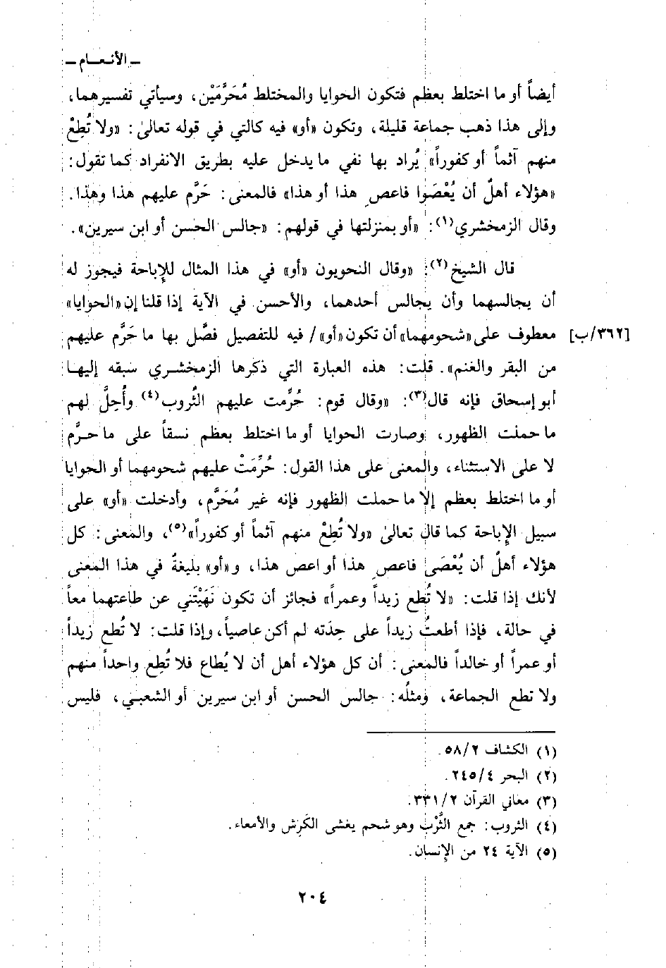 قلت: هذه العبارة التي ذكرها الزمخشري سبقه إليها أبو إسحاق فإنه قال: «وقال قوم: حُرِّمت عليهم الثُروب وأُحِلَّ لهم ما حملت الظهور، وصارت الحوايا أو ما اختلط بعظم نسقاً على ما حرَّم لا على الاستثناء، والمعنى على هذا القول: حُرِّمَتْ عليهم شحومهما أو الحوايا أو ما اختلط بعظم إلا ما حملت الظهور فإنه غير مُحَرَّم، وأدخلت» أو «على سبيل الإِباحة كما قال تعالى {وَلاَ تُطِعْ مِنْهُمْ آثِماً أَوْ كَفُوراً} [الإِنسان: 24] ، والمعنى: كل هؤلاء أهلٌ أن يُعْصَى فاعصِ هذا أو اعص هذا، و» أو «بليغةٌ في هذا المعنى لأنك إذا قلت:» لا تُطع زيداً وعمراً «فجائز أن تكون نَهَيْتَني عن طاعتهما معاً في حالة، فإذا أطعتُ زيداً على حِدَته لم أكن عاصياً، وإذا قلت: لا تُطع زيداً أو عمراً أو خالداً فالمعنى: أن كل هؤلاء أهل أن لا يُطاع فلا تُطِع واحداً منهم ولا تطع الجماعة، ومثلُه: جالس الحسن أو ابن سيرين أو الشعبي، فليس