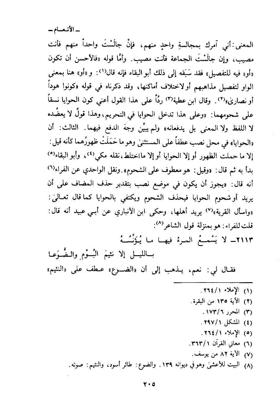المعنى: أني آمرك بمجالسةِ واحدٍ منهم، فإنْ جالَسْتَ واحداً منهم فأنت مصيب، وإن جالَسْتَ الجماعة فأنت مصيب. وأمَّا قوله» فالأحسن أن تكون «أو» فيه للتفصيل «فقد سَبَقه إلى ذلك أبو البقاء فإنه قال: و» أو «هنا بمعنى الواو لتفصيل مذاهبهم أو لاختلاف أماكنها، وقد ذكرناه في قوله {كُونُواْ هُوداً أَوْ نصارى} [البقرة: 135] . وقال ابن عطية ردَّاً على هذا القول أعني كون الحوايا نسقاً على شحومهما:» وعلى هذا تدخل الحوايا في التحريم، وهذا قولٌ لا يعضُده لا اللفظ ولا المعنى بل يدفعانه «ولم يبيِّن وجهَ الدفع فيهما. الثالث: أن» الحوايا «في محل نصب عطفاً على المستثنى وهو ما حَمَلَتْ ظهورُهما كأنه قيل: إلا ما حملت الظهور أو إلا الحوايا أو إلا ما اختلط، نقله مكي، وأبو البقاء بدأ به ثم قال:» وقيل: هو معطوف على الشحوم «. ونقل الواحدي عن الفراء أنه قال:» يجوز أن يكون في موضع نصب بتقدير حذف المضاف على أن يريد أو شحوم الحوايا فيحذف الشحوم ويكتفي بالحوايا كما قال تعالى: {وَسْئَلِ القرية} [يوسف: 82] يريد أهلها، وحكى ابن الأنباري عن أبي عبيد أنه قال: قلت للفراء: هو بمنزلة قول الشاعر: