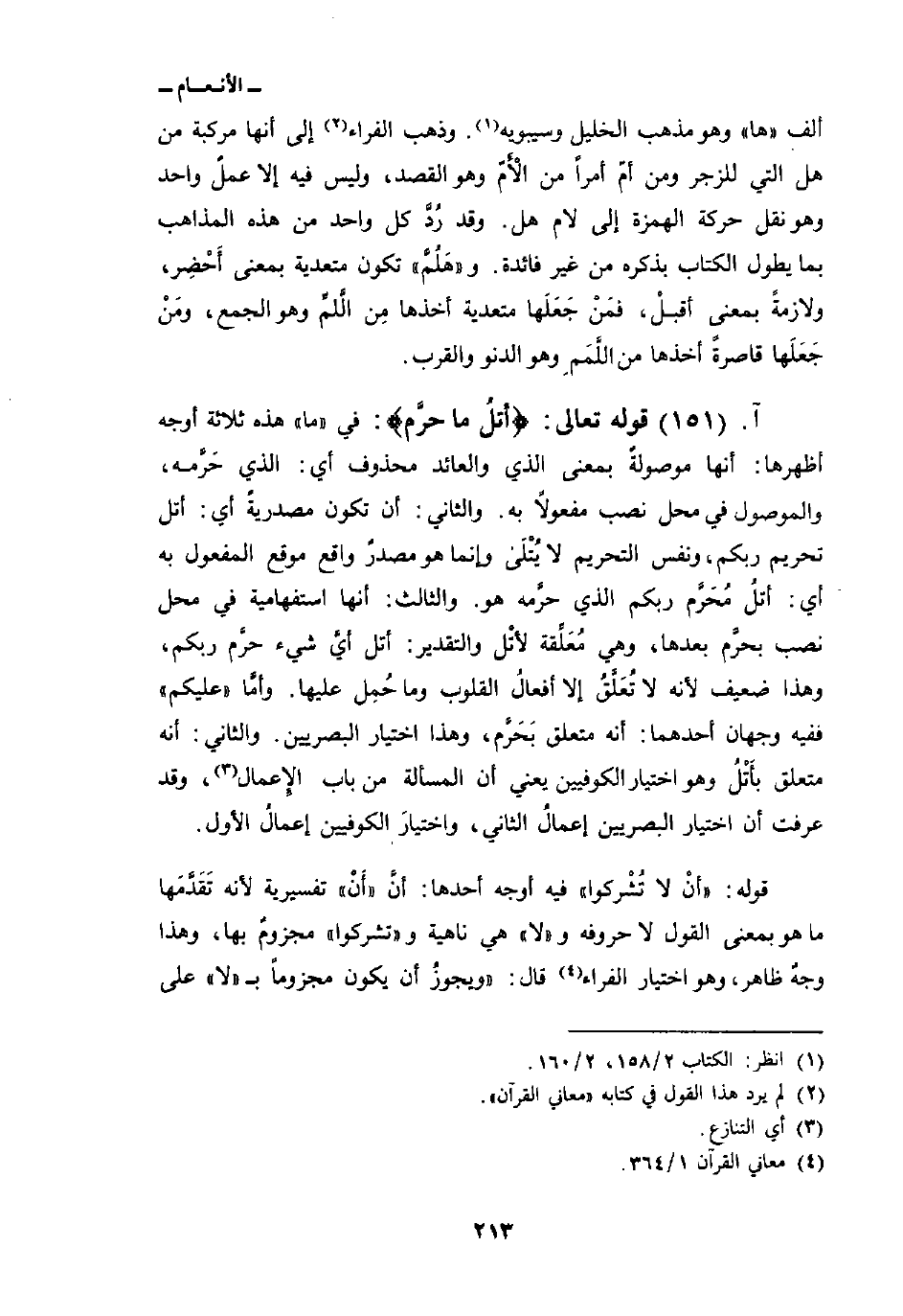 قوله تعالى: {أَتْلُ مَا حَرَّمَ} : في «ما» هذه ثلاثة أوجه أظهرها: أنها موصولةٌ بمعنى الذي والعائد محذوف أي: الذي حَرَّمه، والموصول في محل نصب مفعولاً به. والثاني: أن تكون مصدريةً أي: أتل تحريم ربكم، ونفس التحريم لا يُتْلَى وإنما هو مصدرٌ واقع موقع المفعول به أي: أتلُ مُحَرَّم ربكم الذي حرَّمه هو. والثالث: أنها استفهامية في محل نصب بحرَّم بعدها، وهي مُعَلِّقة لأتْل والتقدير: أتل أيَّ شيء حرَّم ربكم، وهذا ضعيف لأنه لا تُعَلَّقُ إلا أفعالُ القلوب وما حُمِل عليها. وأمَّا «عليكم» ففيه وجهان أحدهما: أنه متعلق بَحَرَّم، وهذا اختيار البصريين. والثاني: أنه متعلق بأَتْلُ وهو اختيار الكوفيين يعني أن المسألة من باب الإِعمال، وقد عرفت أن اختيار البصريين إعمالُ الثاني، واختيارَ الكوفيين إعمالُ الأول.