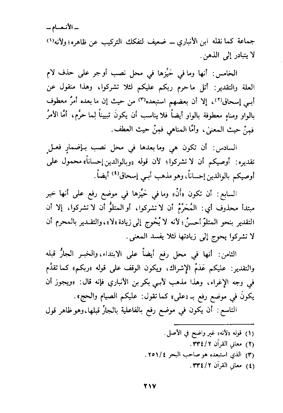 الثامن: أنها في محل رفع أيضاً على الابتداء، والخبر الجارُّ قبله والتقدير: عليكم عَدَمُ الإِشراك، ويكون الوقف على قوله» ربكم «كما تقدَّم في وجه الإِغراء، وهذا مذهب لأبي بكر بن الأنباري فإنه قال:» ويجوز أن يكونَ في موضع رفع ب «على» كما تقول: عليكم الصيام والحج «.