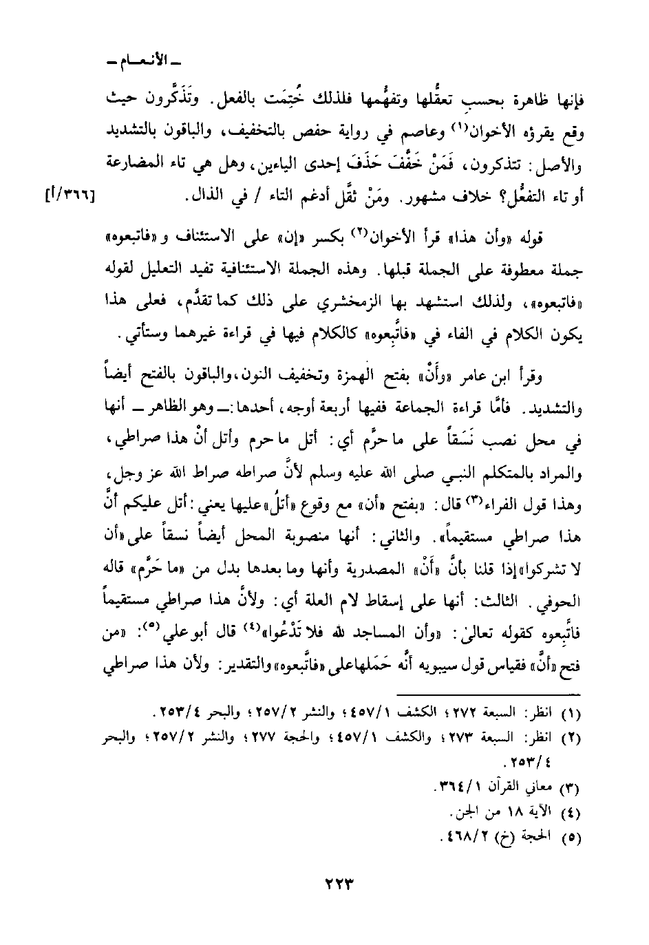 وقرأ ابن عامر «وأَنْ» بفتح الهمزة وتخفيف النون، والباقون بالفتح أيضاً والتشديد. فأمَّا قراءة الجماعة ففيها أربعة أوجه، أحدها: وهو الظاهر أنها في محل نصب نَسَقاً على ما حرَّم أي: أتل ما حرم وأتل أنْ هذا صراطي، والمراد بالمتكلم النبي صَلَّى اللهُ عَلَيْهِ وَسَلَّمَ لأنَّ صراطه صراط لله عز وجل، وهذا قول الفراء قال: «بفتح» أن «مع وقوع» أتلُ «عليها يعني: أتل عليكم أنَّ هذا صراطي مستقيماً. والثاني: أنها منصوبة المحل أيضاً نسقاً على» أن لا تشركوا «إذا قلنا بأنَّ» أَنْ «المصدرية وأنها وما بعدها بدل من» ما حَرَّم «قاله الحوفي.