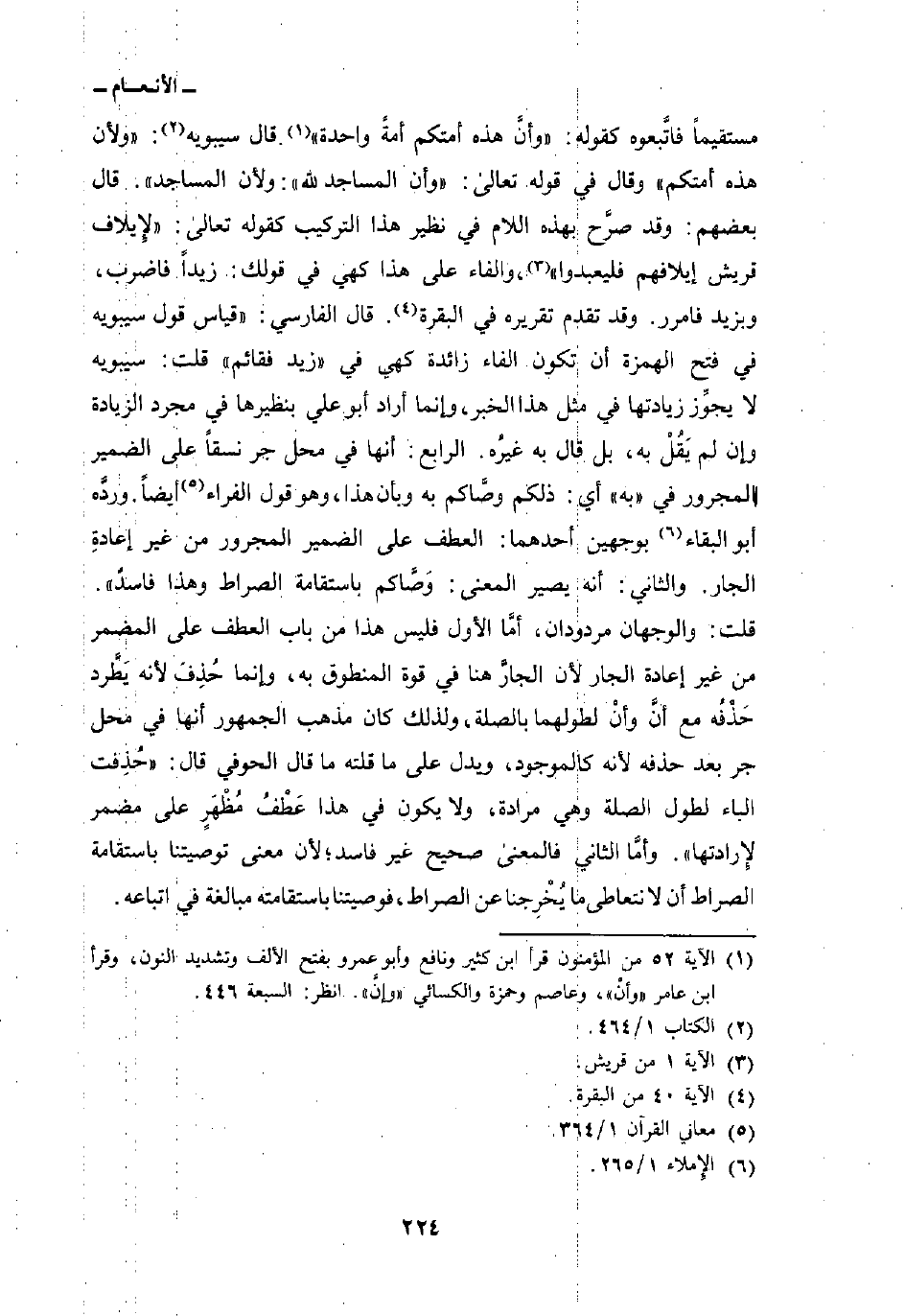 مستقيماً فاتَّبعوه كقوله: {وَأنَّ هذه أُمَّتُكُمْ أُمَّةً وَاحِدَةً} [المؤمنون: 52] . قال سيبويه:» ولأن هذه أمتكم «وقال في قوله تعالى:» وأن المساجد لله «: ولأن المساجد» . قال بعضهم: وقد صرَّح بهذه اللام في نظير هذا التركيب كقوله تعالى: {لإِيلاَفِ قُرَيْشٍ إِيلاَفِهِمْ. . . فَلْيَعْبُدُواْ} [قريش: 1] ، والفاء على هذا كهي في قولك: زيداً فاضرب، وبزيد فامرر. وقد تقدم تقريره في البقرة. قال الفارسي: «قياس قول سيبويه في فتح الهمزة أن تكون الفاء زائدة كهي في» زيد فقائم «قلت: سيبويه لا يجوِّز زيادتها في مثل هذا الخبر، وإنما أراد أبو علي بنظيرها في مجرد الزيادة وإن لم يَقُلْ به، بل قال به غيرُه. الرابع: أنها في محل جر نسقاً على الضمير المجرور في» به «أي: ذلكم وصَّاكم به وبأن هذا، وهو قول الفراء أيضاً. وردَّه أبو البقاء بوجهين أحدهما: العطف على الضمير المجرور من غير إعادةِ الجار. والثاني: أنه يصير المعنى: وَصَّاكم باستقامة الصراط وهذا فاسدٌ» . قلت: والوجهان مردودان، أمَّا الأول فليس هذا من باب العطف على المضمر من غير إعادة الجار لأن الجارَّ هنا في قوة المنطوق به، وإنما حُذِفَ لأنه يَطَّرد حَذْفُه مع أنَّ وأنْ لطولهما بالصلة، ولذلك كان مذهب الجمهور أنها في محل جر بعد حذفه لأنه كالموجود، ويدل على ما قلته ما قال الحوفي قال: «حُذِفت الباء لطول الصلة وهي مرادة، ولا يكون في هذا عَطْفُ مُظْهَرٍ على مضمر لإِرادتها» . وأمَّا الثاني فالمعنى صحيح غير فاسد؛ لأن معنى توصيتنا باستقامة الصراط أن لا نتعاطى ما يُخْرِجنا عن الصراط، فوصيتنا باستقامته مبالغة في اتباعه.