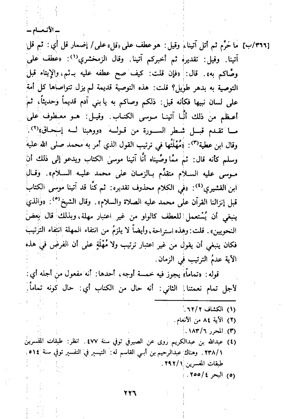 قوله: {تَمَاماً} يجوز فيه خمسة أوجه، أحدها: أنه مفعول من أجله أي: لأجل تمام نعمتنا. الثاني: أنه حال من الكتاب أي: حال كونه تماماً.