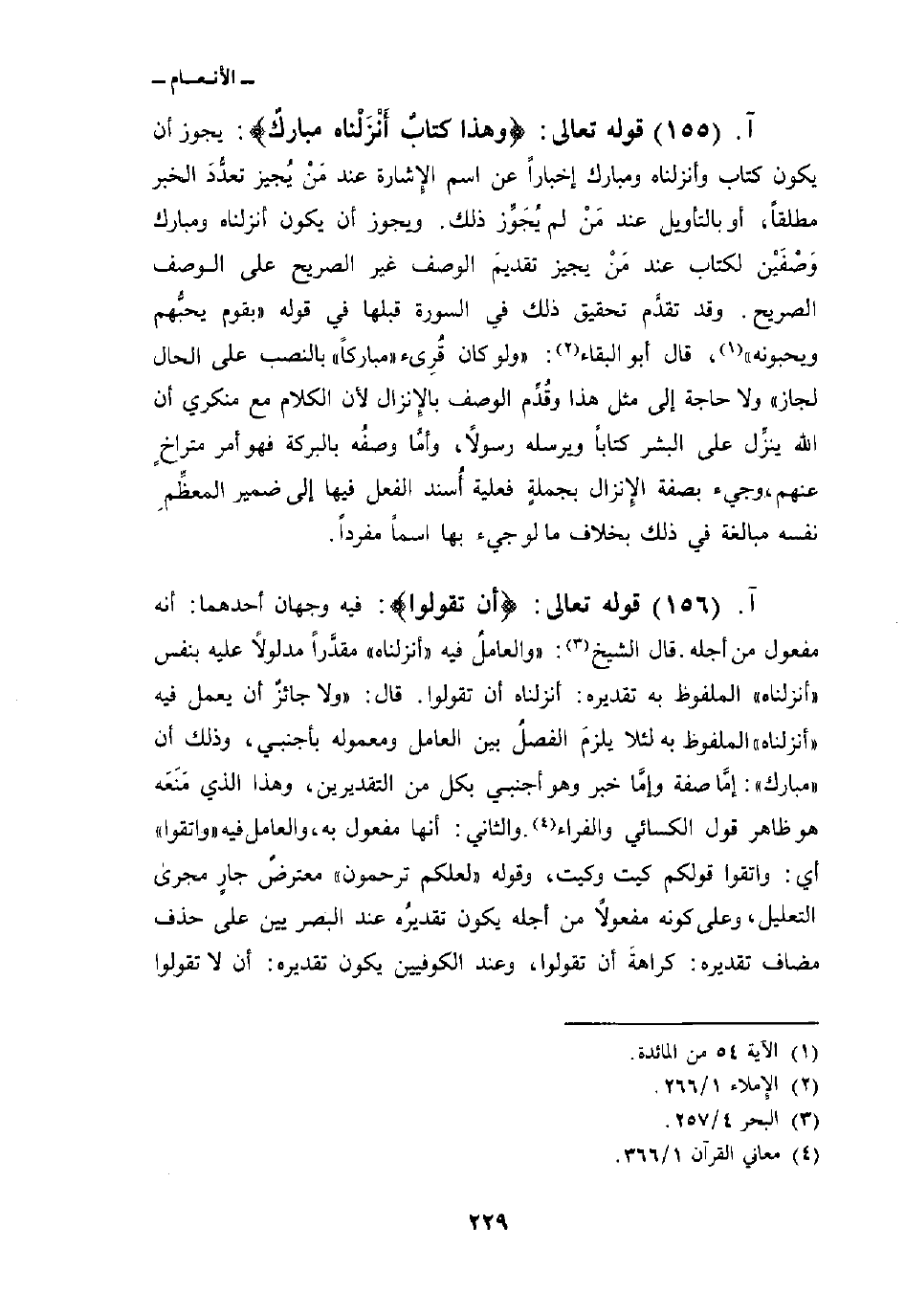 قوله تعالى: {أَن تقولوا} : فيه وجهان أحدهما: أنه مفعول من أجله. قال الشيخ: «والعاملُ فيه» أنزلناه «مقدَّراً مدلولاً عليه بنفس» أنزلناه «الملفوظ به تقديره: أنزلناه أن تقولوا. قال:» ولا جائزٌ أن يعمل فيه «أنزلناه» الملفوظ به لئلا يلزمَ الفصلُ بين العامل ومعموله بأجنبي، وذلك أن «مبارك» : إمَّا صفة وإمَّا خبر وهو أجنبي بكل من التقديرين، وهذا الذي مَنَعَه هو ظاهر قول الكسائي والفراء. والثاني: أنها مفعول به، والعامل فيه «واتقوا» أي: واتقوا قولكم كيت وكيت، وقوله «لعلكم ترحمون» معترضٌ جارٍ مجرى التعليل، وعلى كونه مفعولاً من أجله يكون تقديرُه عند البصريين على حذف مضاف تقديره: كراهةَ أن تقولوا، وعند الكوفيين يكون تقديره: أن لا تقولوا