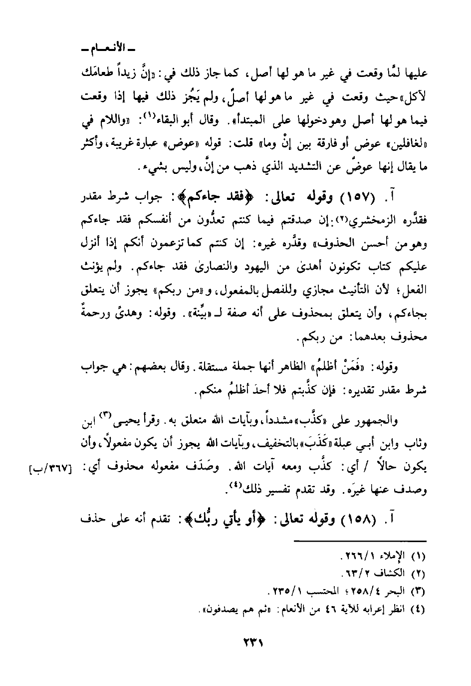 وقوله تعالى: {فَقَدْ جَآءَكُمْ} : جواب شرط مقدر فقدَّره الزمخشري: إن صدقتم فيما كنتم تعدُّون من أنفسكم فقد جاءكم وهو من أحسن الحذوف «وقدَّره غيره: إن كنتم كما تزعمون أنكم إذا أنزل عليكم كتاب تكونون أهدى من اليهود والنصارى فقد جاءكم. ولم يؤنث الفعل؛ لأن التأنيث مجازي وللفصل بالمفعول، و» من ربكم «يجوز أن يتعلق بجاءكم، وأن يتعلق بمحذوف على أنه صفة ل» بيِّنة «. وقوله: وهدىً ورحمةً محذوف بعدهما: من ربكم.