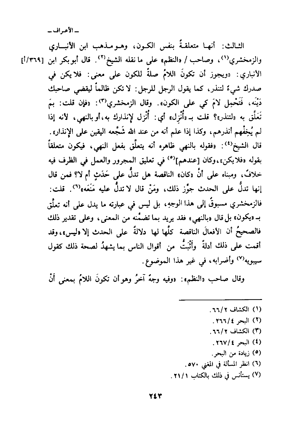 قال أبو بكر ابن الأنباري: «ويجوز أن تكونَ اللامُ صلةً للكون على معنى: فلا يكن في صدرك شيءٌ لتنذر، كما يقول الرجل للرجل: لا تكن ظالماً ليقضي صاحبك دَيْنَه، فَتَحْمِل لامَ كي على الكون» . وقال الزمخشري: «فإن قلت: بمَ تَعَلَّق به» لتنذر «؟ قلت ب» أُنْزِل «أي: أُنْزل لإِنذارك به، أو بالنهي، لأنه إذا لم يُخِفْهم أنذرهم، وكذا إذا علم أنه من عند الله شَجَّعه اليقين على الإِنذار» . قال الشيخ: «فقوله بالنهي ظاهره أنه يتعلَّق بفعل النهي، فيكون متعلقاً بقوله» فلا يكن «، وكان [عندهم] في تعليق المجرور والعمل في الظرف فيه خلافٌ، ومبناه على أنَّ» كان «الناقصة هل تدلُّ على حَدَثٍ أم لا؟ فمن قال إنها تدلُّ على الحدث جوَّز ذلك، ومَنْ قال لا تدلُّ عليه مَنَعَه» . قلت: فالزمخشري مسبوقٌ إلى هذا الوجهِ، بل ليس في عبارته ما يدل على أنه تعلُّق ب «يكون» بل قال «بالنهي» فقد يريد بما تضمَّنه من المعنى، وعلى تقدير ذلك فالصحيحُ أن الأفعالَ الناقصة كلَّها لها دلالةٌ على الحدث إلا «ليس» ، وقد أقمت على ذلك أدلةً وأَثْبَتُّ من أقوال الناس بما يشهدُ لصحة ذلك كقول سيبويه وأضرابه، في غير هذا الموضوع.