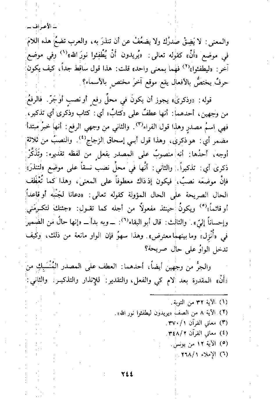 والمعنى: لا يَضِقْ صدرُك ولا يضعُفْ عن أن تنذرَ به، والعرب تضعُ هذه اللامَ في موضع» أَنْ «كقوله تعالى: {يُرِيدُونَ أَن يُطْفِئُواْ نُورَ الله} [التوبة: 32] وفي موضع آخر: {لِيُطْفِئُواْ} [الصف: 8] فهما بمعنى واحد» قلت: هذا قول ساقط جداً، كيف يكون حرفٌ يختصُّ بالأفعال يقع موقع آخرَ مختصٍ بالأسماء؟