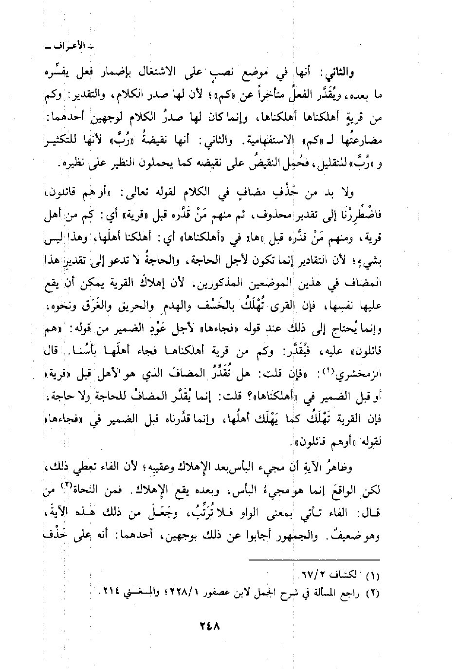 ولا بد من حَذْفِ مضافٍ في الكلام لقوله تعالى: «أو هم قائلون» فاضْطُرِرْنَا إلى تقدير محذوف، ثم منهم مَنْ قَدَّره قبل «قرية» أي: كم من أهل قرية، ومنهم مَنْ قدَّره قبل «ها» في «أهلكناها» أي: أهلكنا أهلَها، وهذا ليس بشيءٍ؛ لأن التقادير إنما تكون لأجل الحاجة، والحاجةُ لا تدعو إلى تقديرِ هذا المضاف في هذين الموضعين المذكورين، لأن إهلاكَ القرية يمكن أن يقع عليها نفسِها، فإن القرى تُهْلَكُ بالخَسْف والهدمِ والحريق والغَرَق ونحوه، وإنما يُحتاج إلى ذلك عند قوله «فجاءها» لأجل عَوْدِ الضمير من قوله: «هم قائلون» عليه، فيُقَدَّر: وكم من قرية أهلكناها فجاء أهلَها بأسُنا. قال الزمخشري: «فإن قلت: هل تُقَدِّرُ المضافَ الذي هو الأهل قبل» قرية «أو قبل الضمير في» أهلكناها «؟ قلت: إنما يُقَدَّر المضافُ للحاجة ولا حاجة، فإن القرية تَهْلَكُ كما يَهْلَك أهلُها، وإنما قدَّرناه قبل الضمير في» فجاءها «لقوله» أو هم قائلون «.